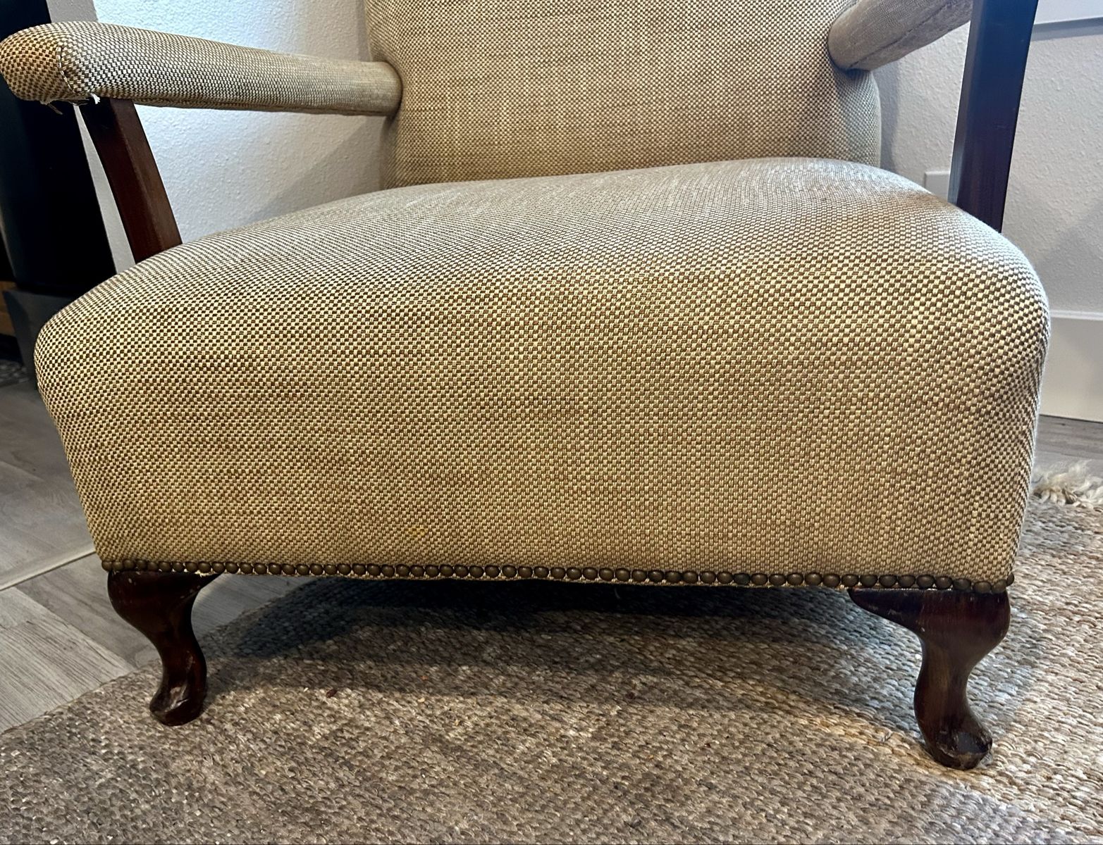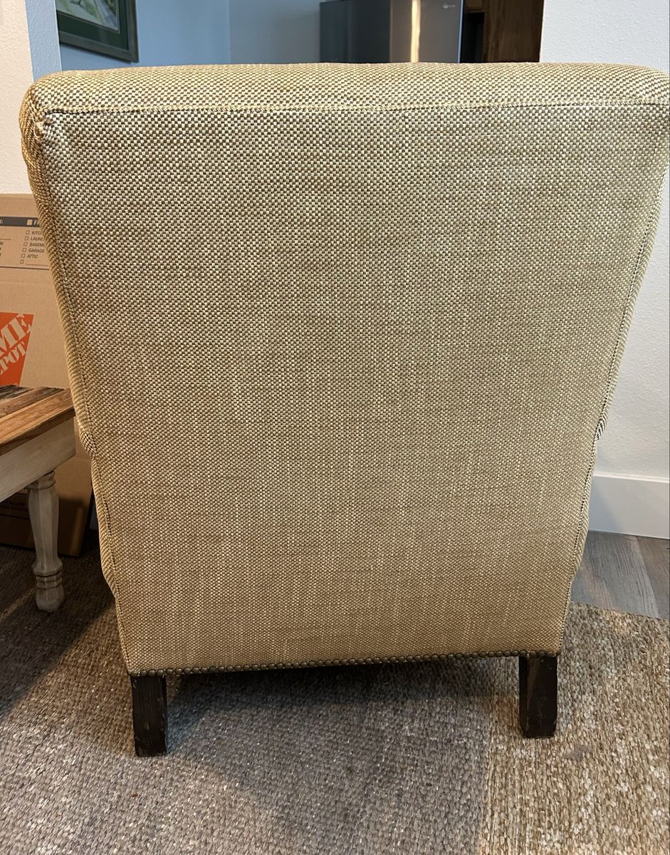 ZelleComfortable tan chair with decorative tacks around base. Consolidating households, so we no longer have room for it.