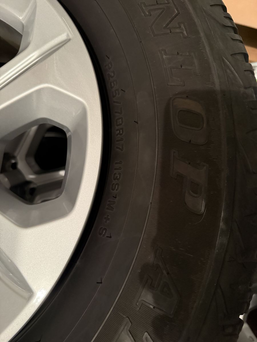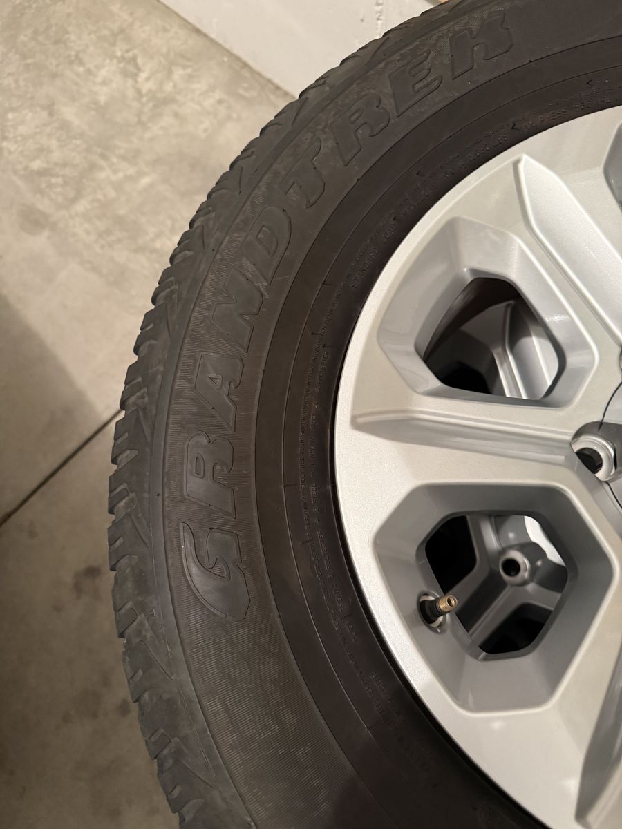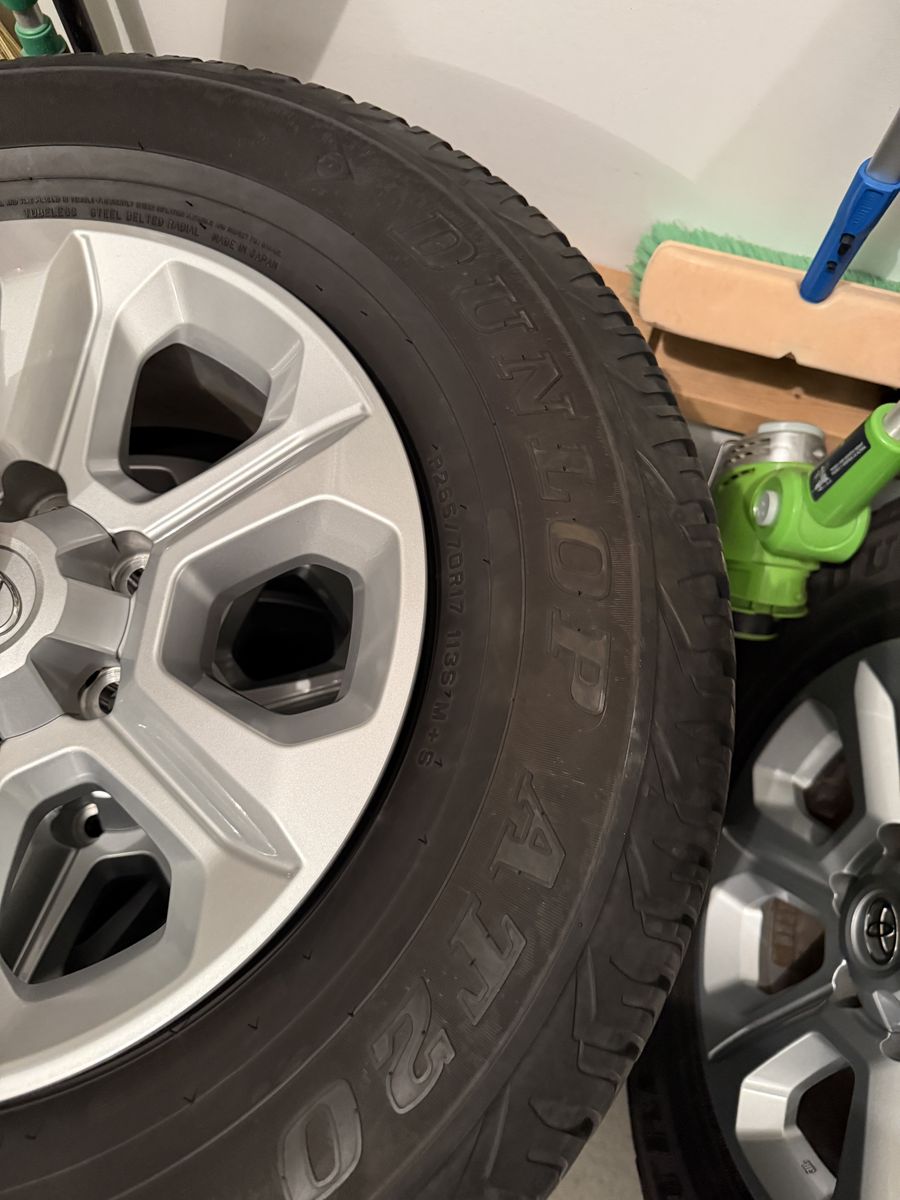 Venmo4 used wheels and tires - 17". Wheels in excellent condition. Stock from a 2023 4Runner. Tires have about 30k miles on them, still some wear left. Tires are Dunlop AT20 Grandtrek - P265/70R17. Tire pressure sensors not included.