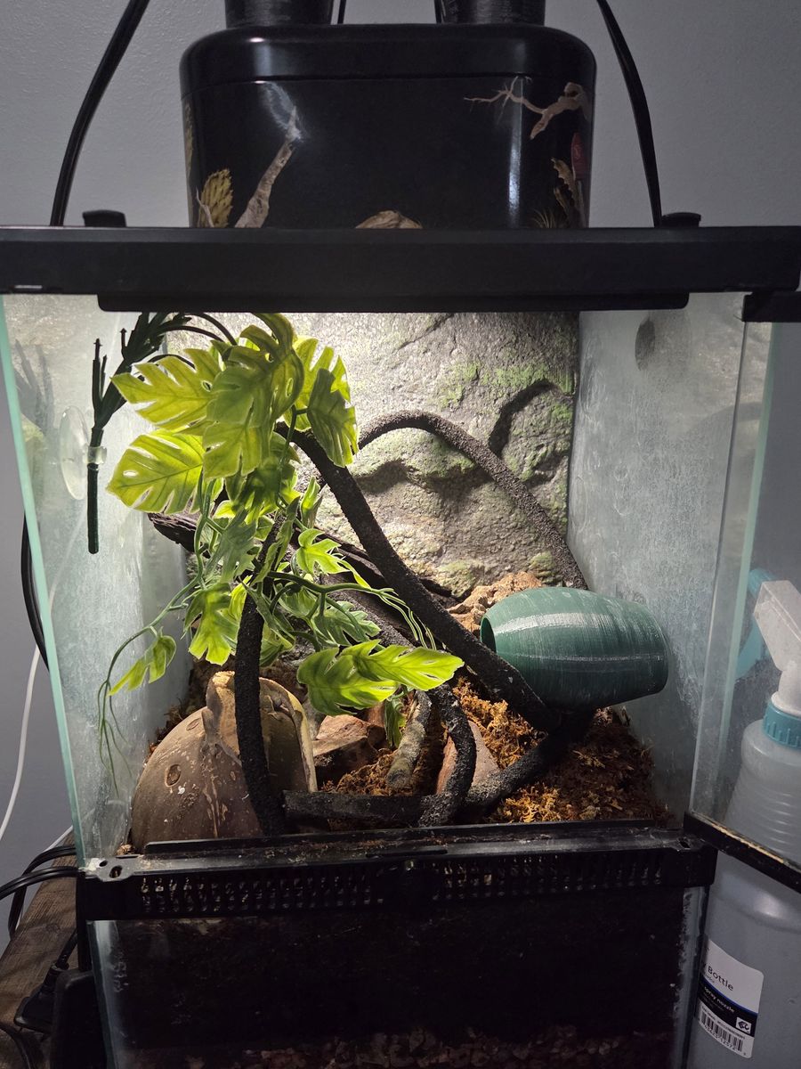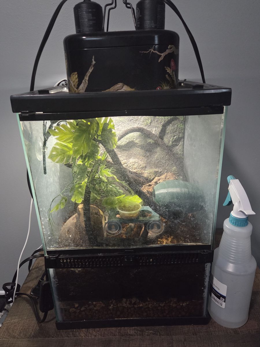 **What’s included (everything you need!):**Full tank setup with a waterfall feature 2 hides Climbing vine Fake plant (he also enjoys real plants if you choose to add them) Heat lamp Light with an automatic timer Food and food cups Repti-vitamins
