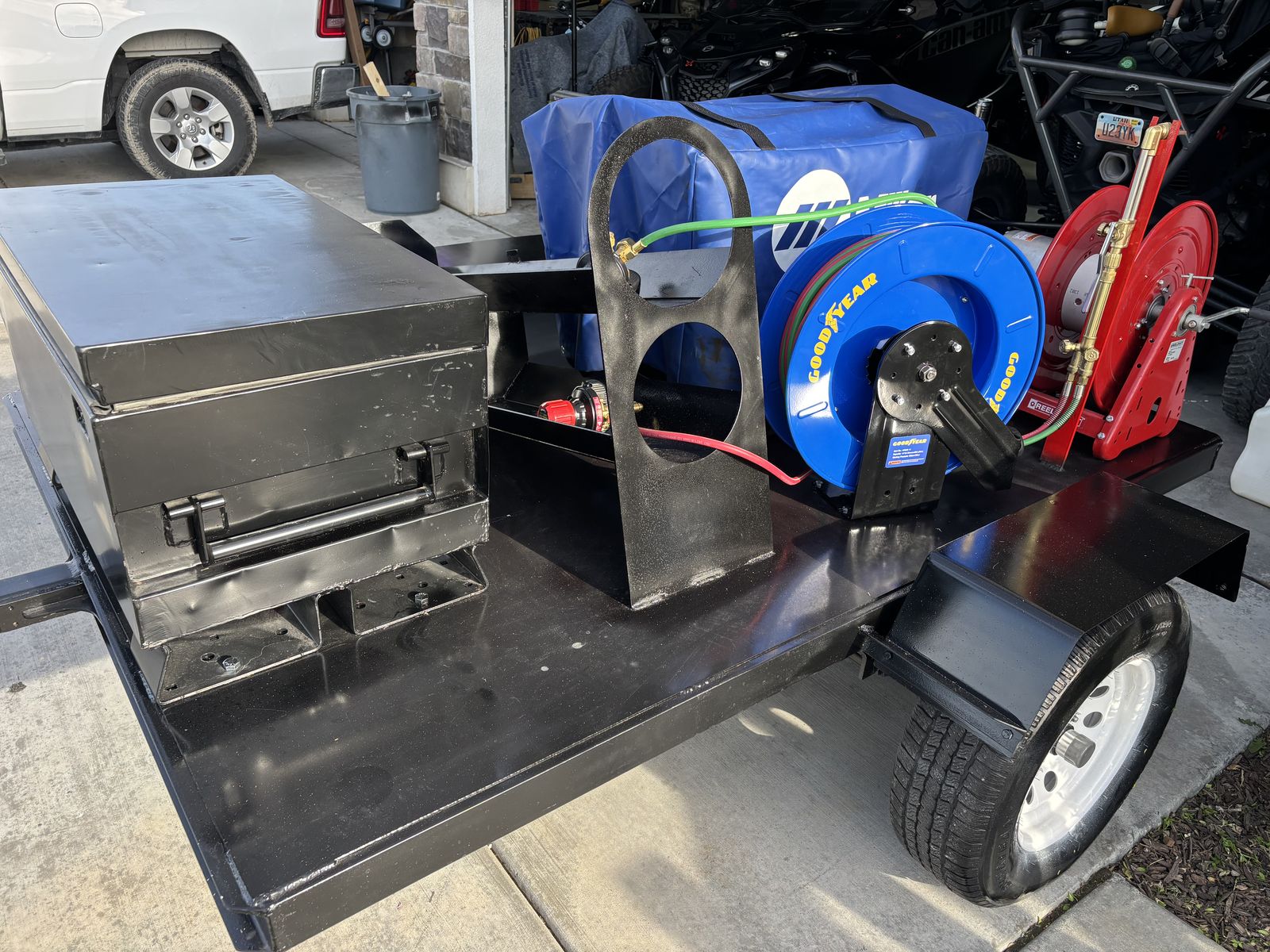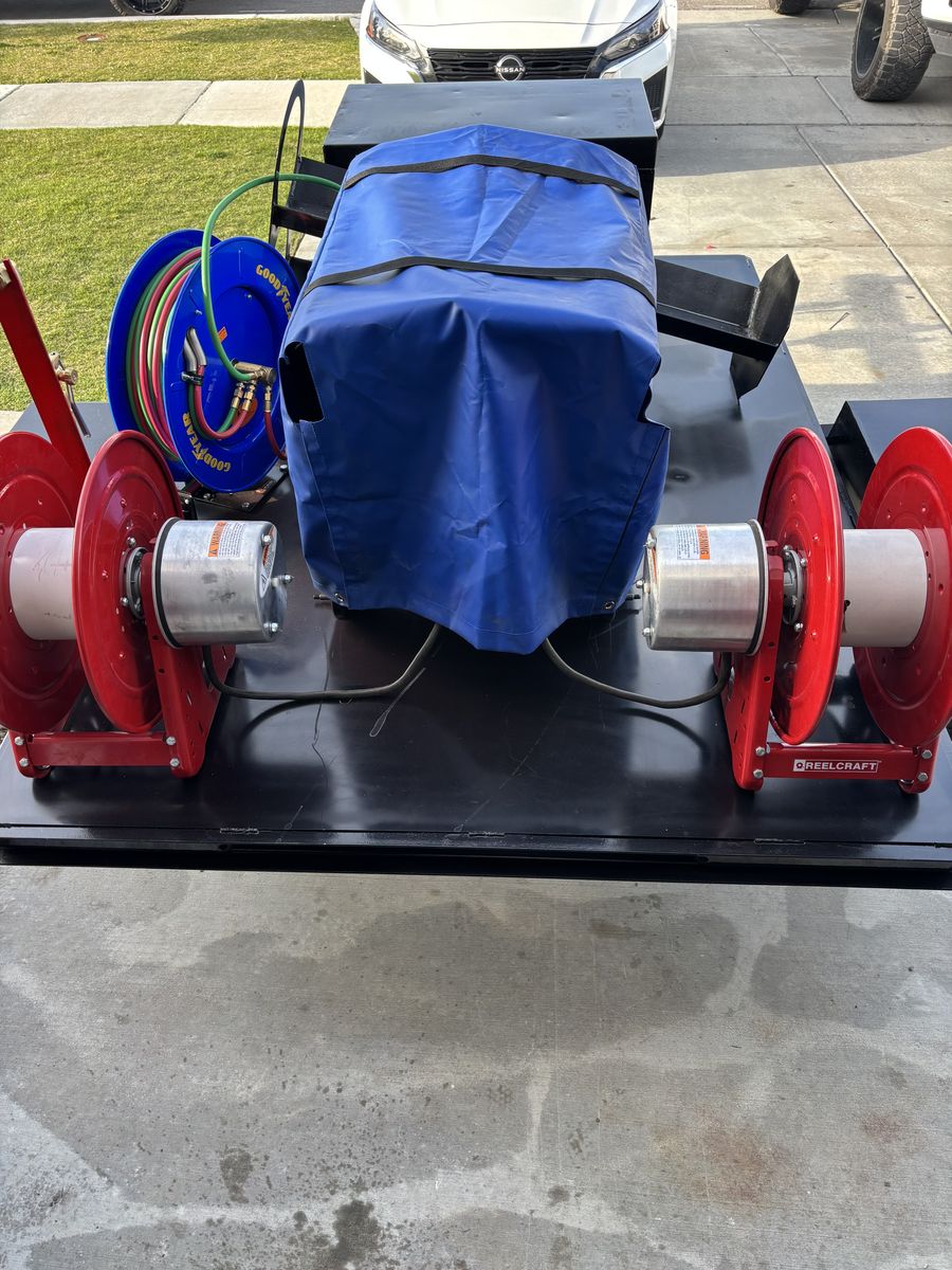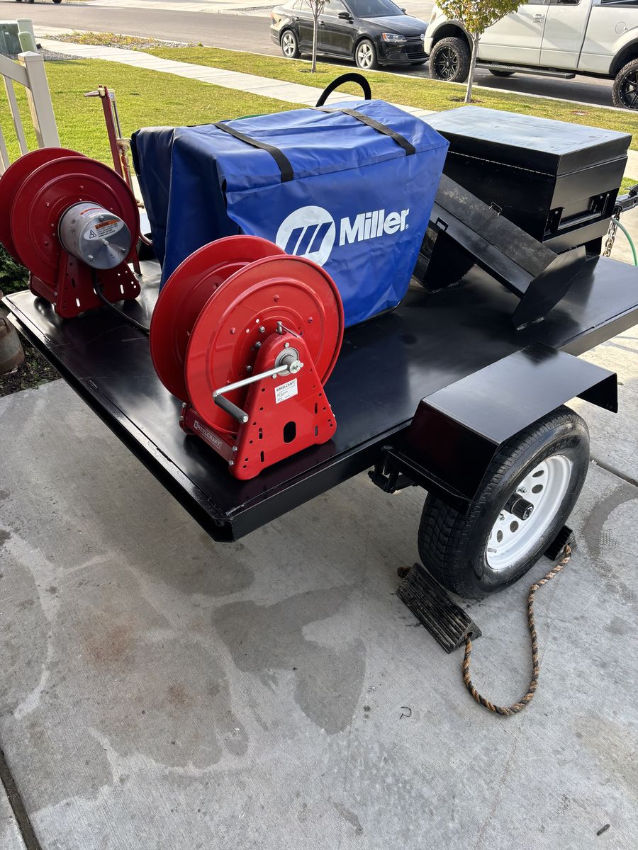Venmocustom build welding trailer with 36" tool box, miller 185 welder, and settling bottle holder and hose reel , with Gage's and torch end. has real craft welding lead reels. The trailer is a 7 x 5 1/2. 2500 IB axle 2" ball. everything is new except for the welder in the toolbox.Any questions just call!