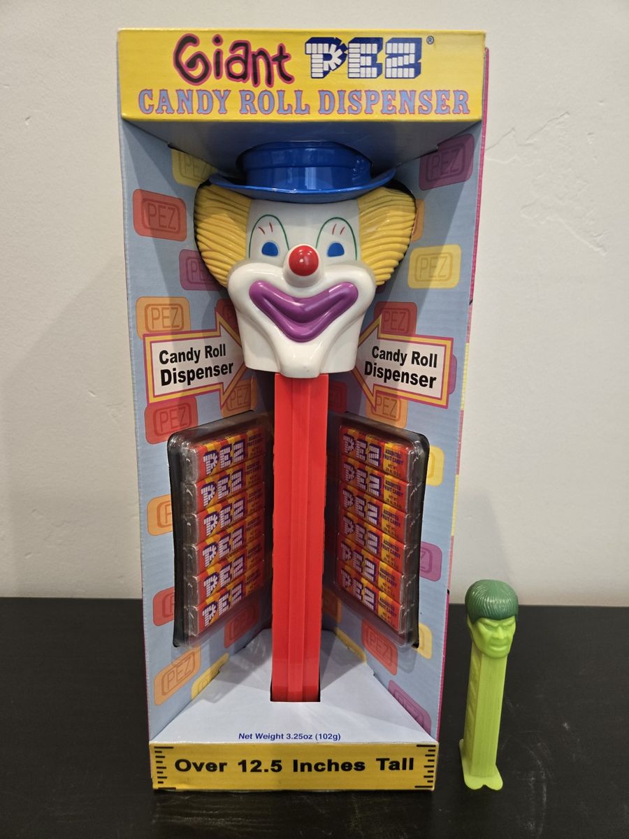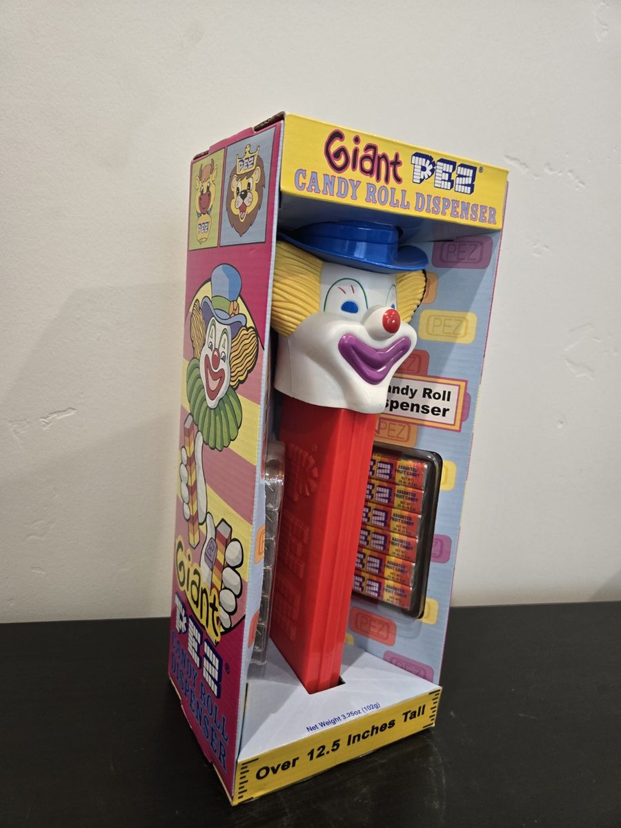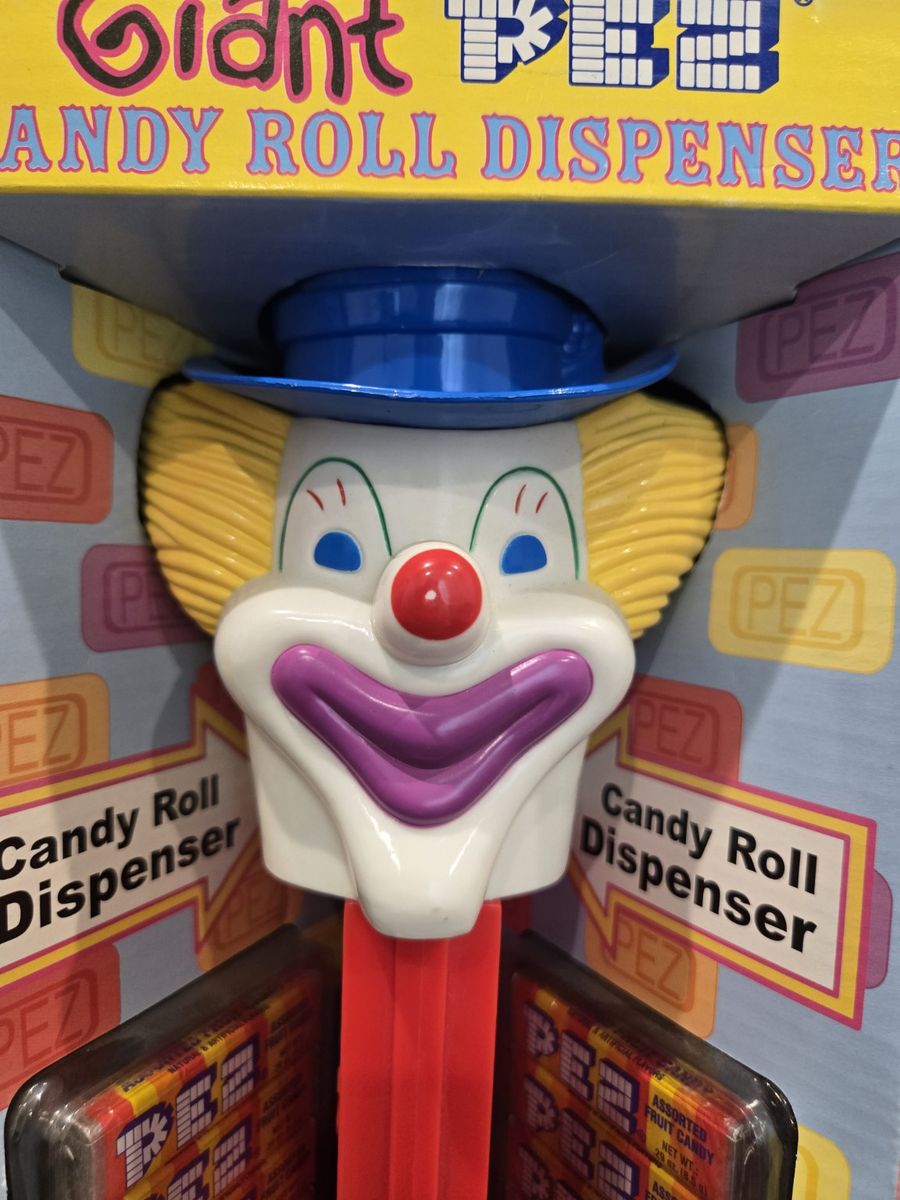 Oversized PEZ dispenser in the classic clown design. Comes in the original box with candy packs included. Great display piece for collectors or a fun, unique gift.