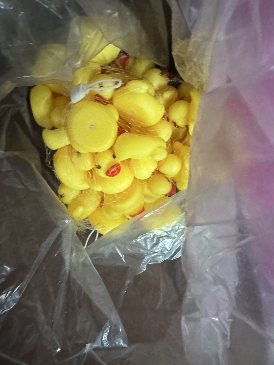 36 small plastic tubs and rubber duckies. Tubs are approx 7.5” long and 3.5” tall. Could be used for party favors or a bunch of different things. Brand new