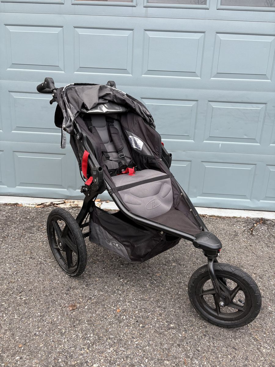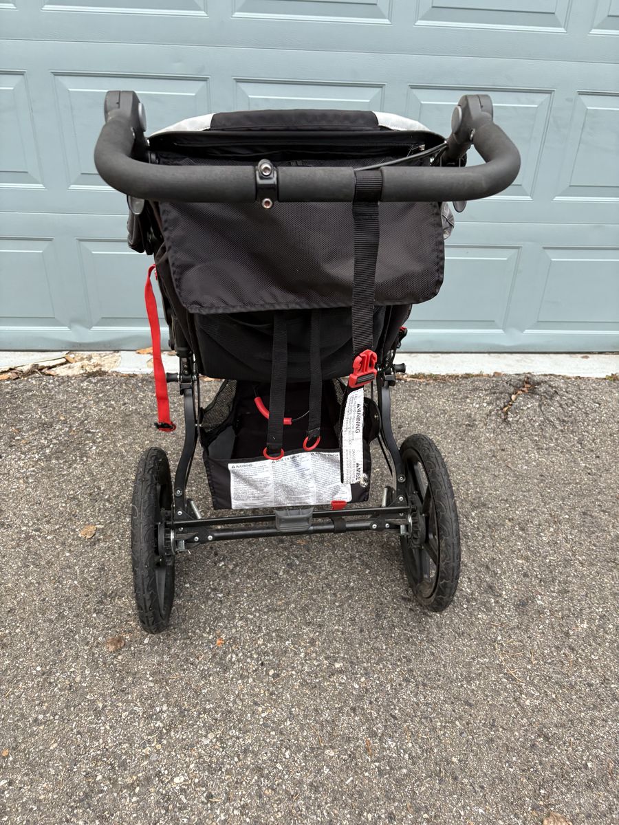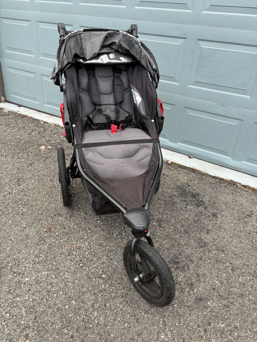 VenmoBob Revolution Pro jogging stroller with handbrake, air-filled tires, suspension, adjustable handle, locking front wheel, storage pocket and underneath cargo compartment.