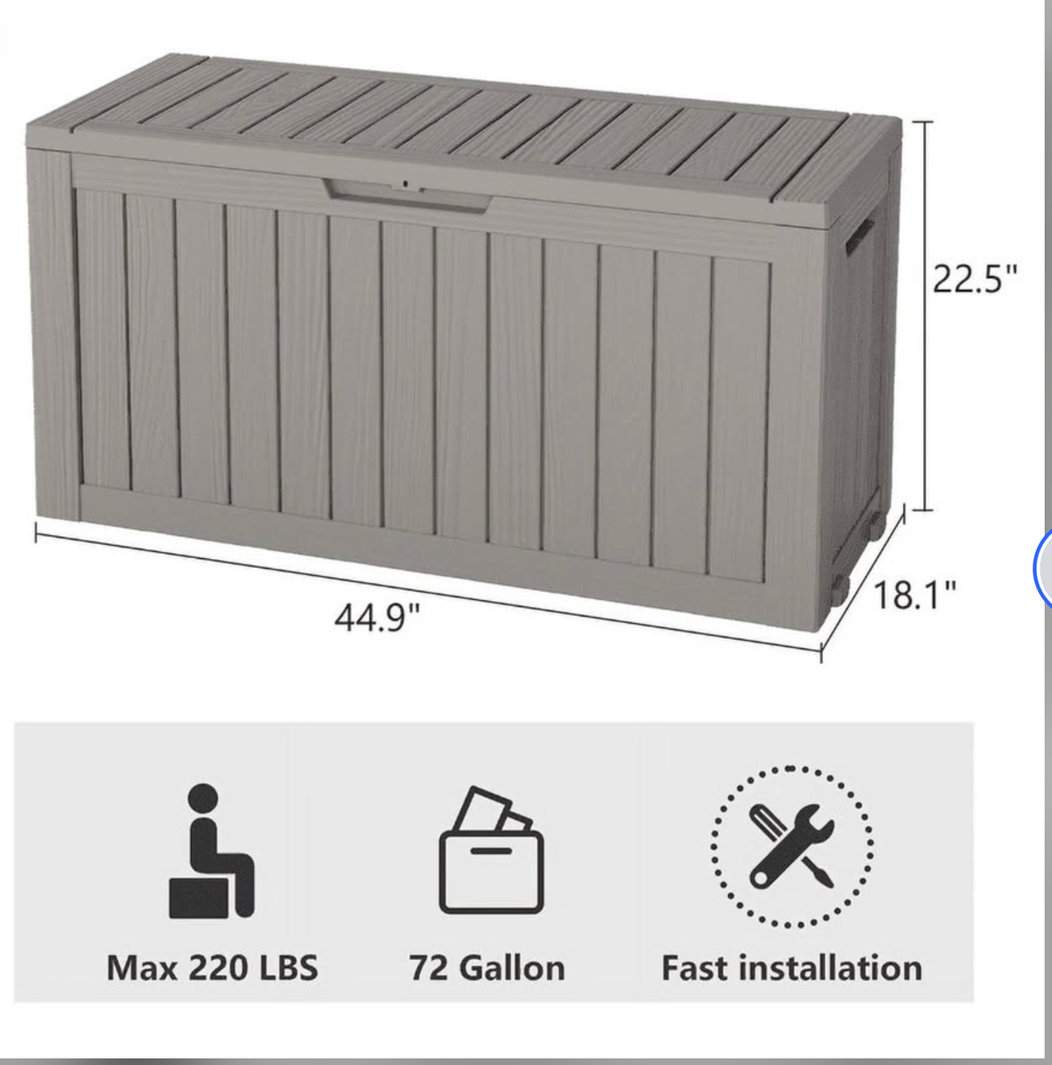 Brand new in box, unassembled, several available..Maximum load weight 330lb 44.90 x 18.10 x 22.50 in...75 Gallon Deck Box Lockable Resin Outdoor Storage Box waterproof Outdoor Container Maximum load weight 330lb 44.90 x 18.10 x 22.50 in Ideal Storage: The LHBcraft outdoor Storage Box holds up to 75 gallons and keeps your outdoor space neat and tidy. Perfect for storing garden tools, pool accessories or patio cushions, this storage box is versatile and spacious Ideal Storage: The LHBcraft outdoor Storage Box holds up to 75 gallons and keeps your outdoor space neat and tidy. Perfect for storing garden tools, pool accessories or patio cushions, this storage box is versatile and spacious Built to Last: Made of resin material, the patio storage box has excellent UV and water resistance for all-weather outdoor environments for years to come Effortless Portability: This patio storage box is designed for easy mobility, allowing you to experience ultimate convenience. Equipped with sturdy wheels and handles on both sides, repositioning the storage unit on your patio or garden is a snap Extra Seating: The multi-purpose outdoor storage bin can be used as extra seating as you require. The waterproof outdoor storage bench can hold the normal weight of up to 2 adults Easy to Assemble: Comes with clear instructions and all the necessary hardware so you can have your new storage solution set up and ready to go. A hassle-free enhancement to your outdoor living space