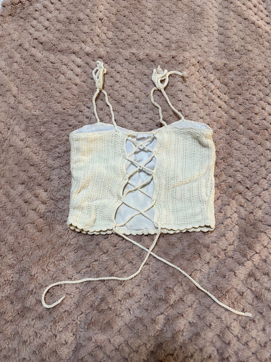 VenmoSelling this darling crochet crop top. It has a beautiful handmade look with a scalloped hem and adjustable tie straps. The back features a stunning lace-up detail that makes the fit adjustable and very flattering. Details: • Color: Cream / Ivory / Off-White • Style: Boho / Festival / Cottagecore • Features: Adjustable tie shoulder straps and a lace-up corset-style back. It is fully lined in the front, so it isn't see-through! • Condition: Excellent condition. No snags or loose threads in the crochet work. • Fit: Because of the lace-up back, it can fit a variety of sizes comfortably. This is the perfect top for summer. From a clean, smoke-free home.