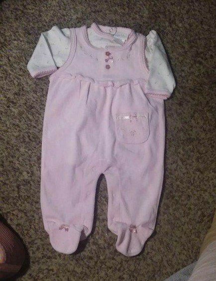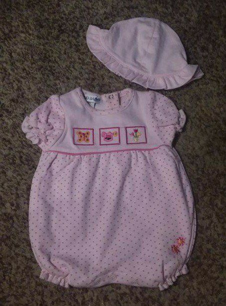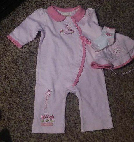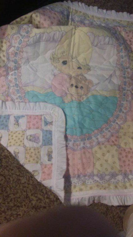 A precious moment quilt with ruffled edges, and 5 beautiful pink outfits for the precious new arrival!