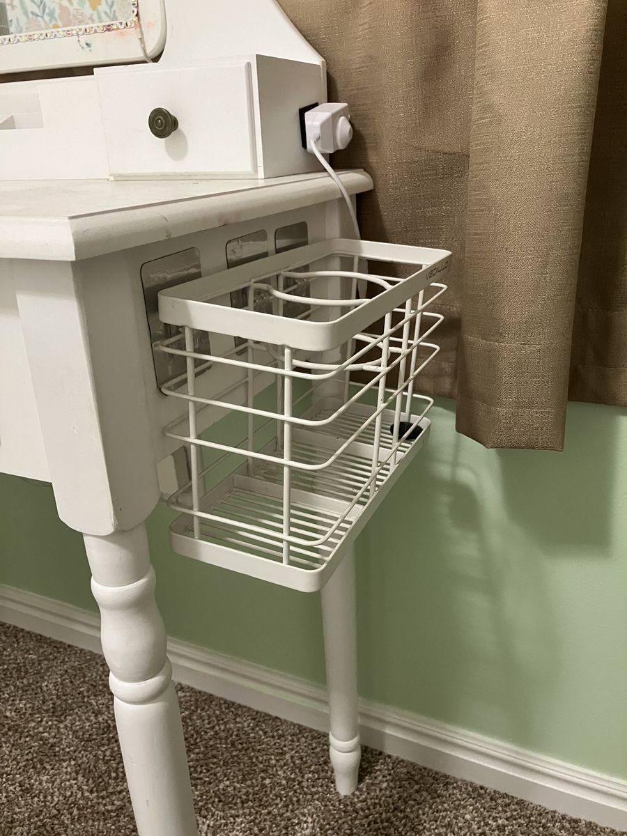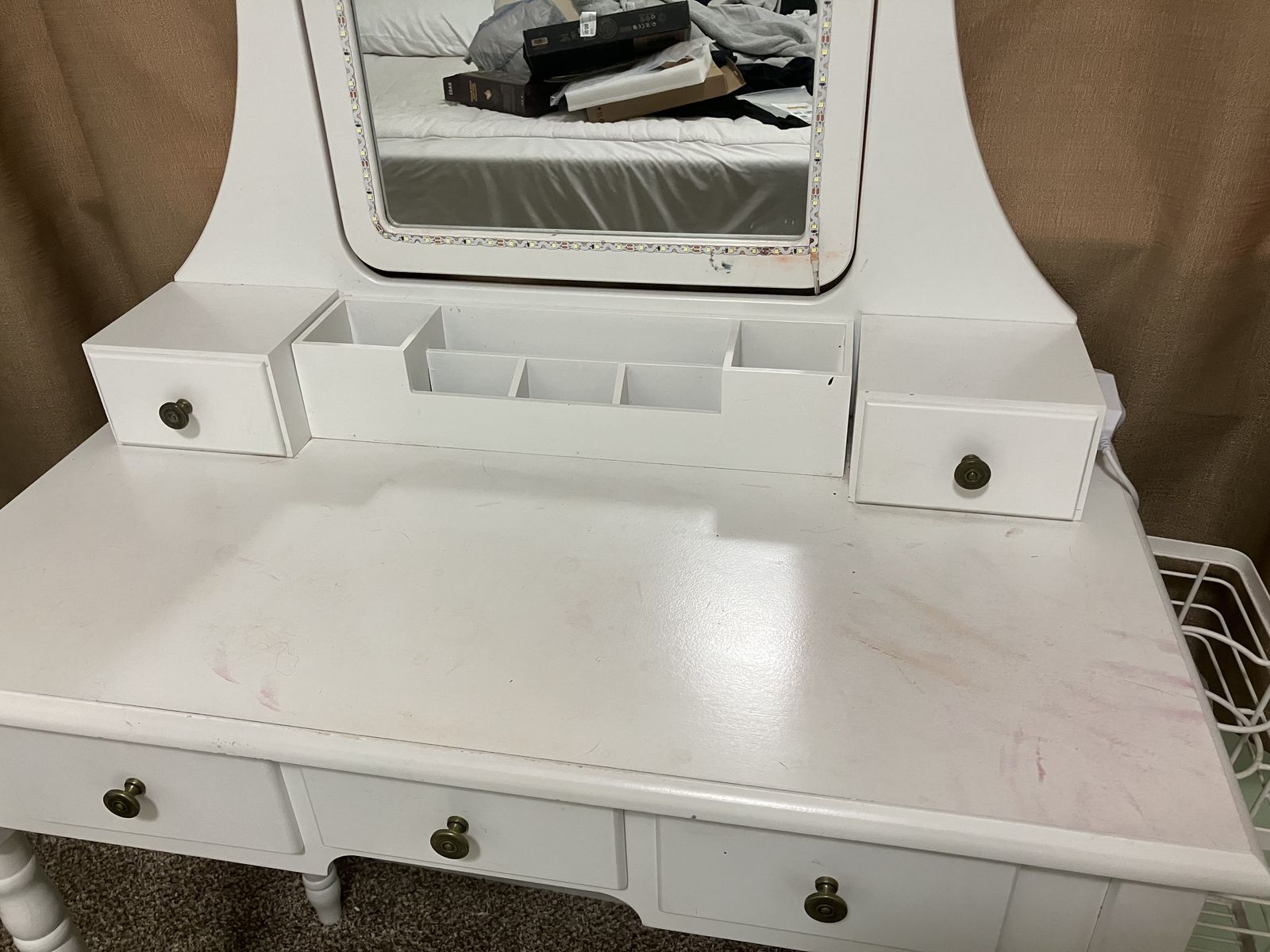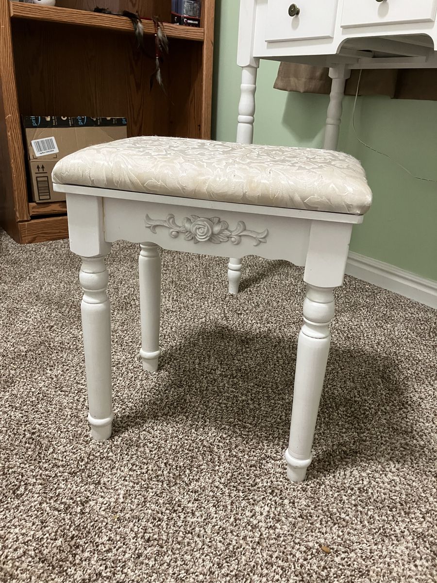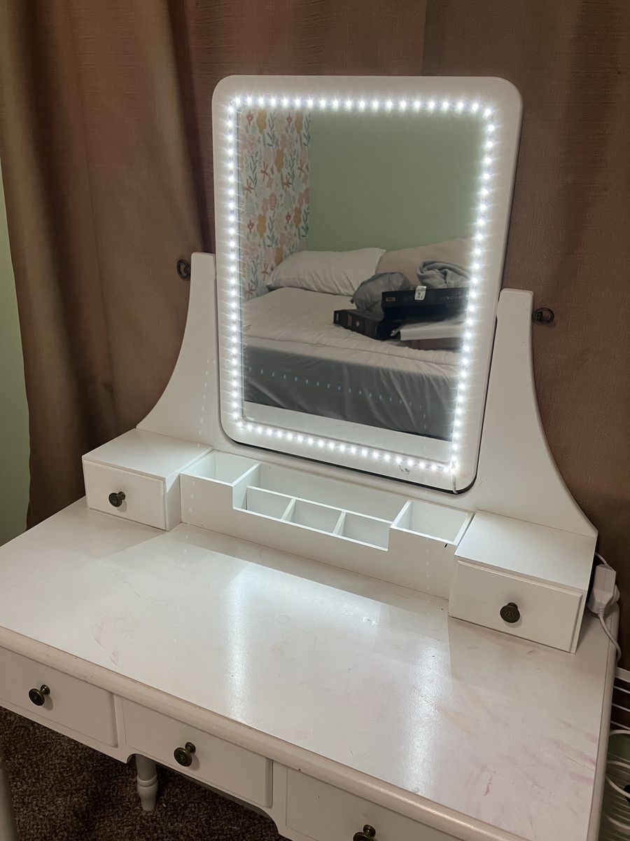 ApplePayWhite Vanity. Good condition. On the smaller side. Adjustable LED lights around the mirror. Side shelf for brushes/styling tools. Has a couple stains. Seat included.