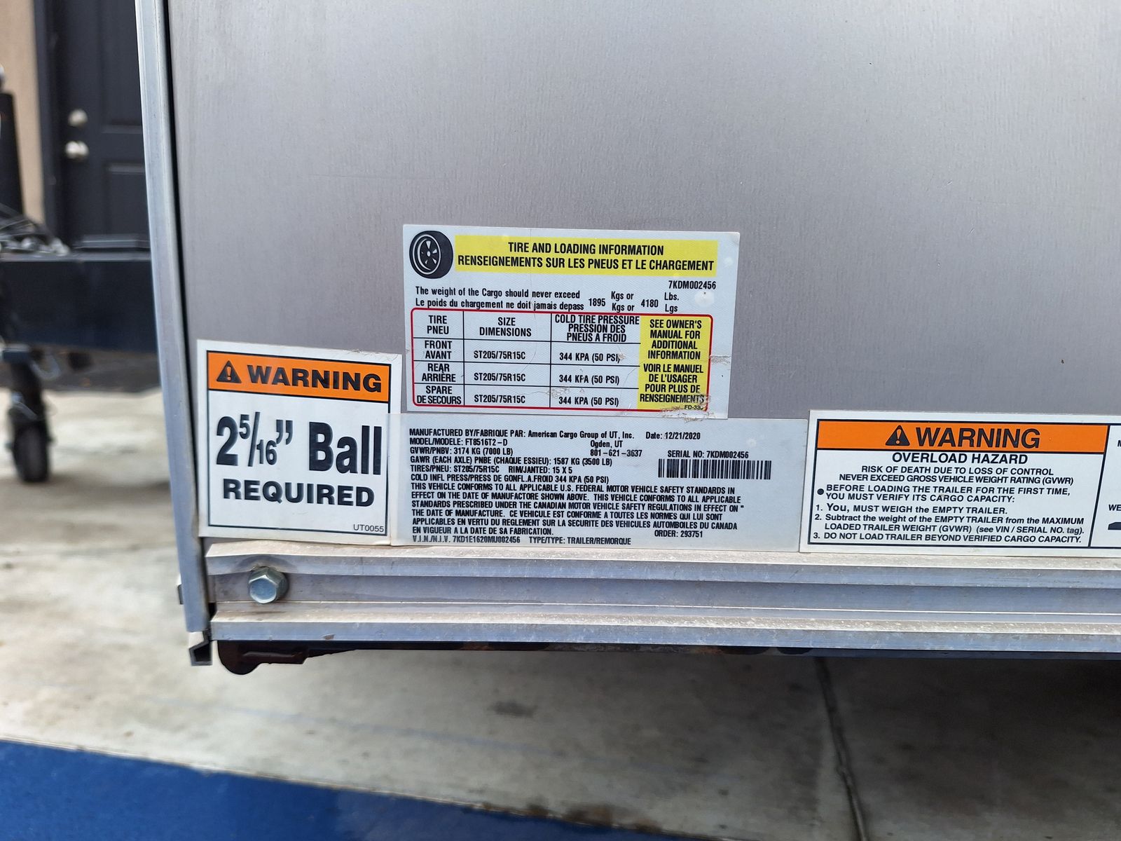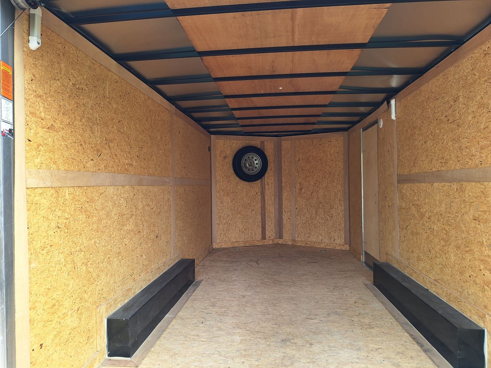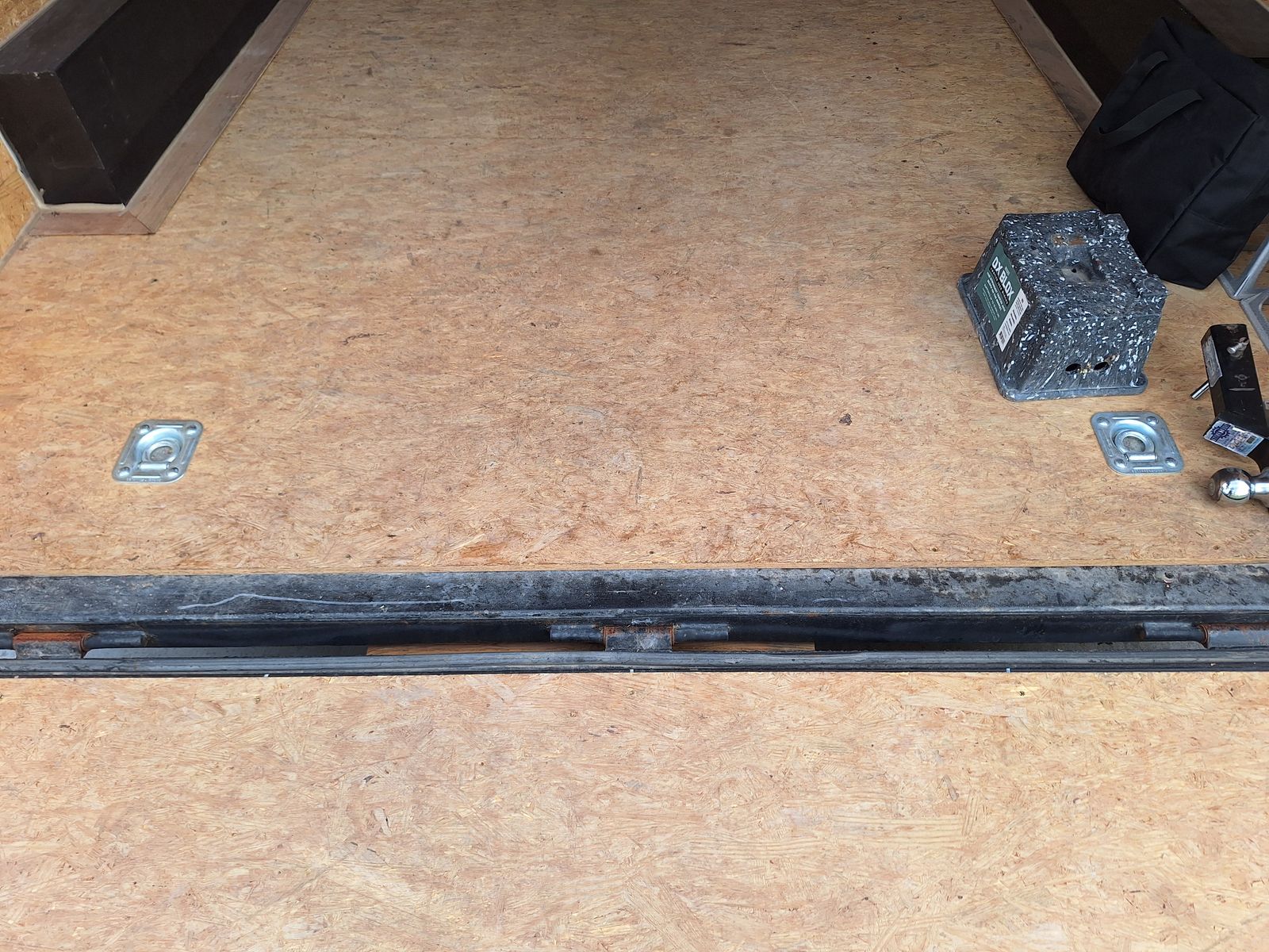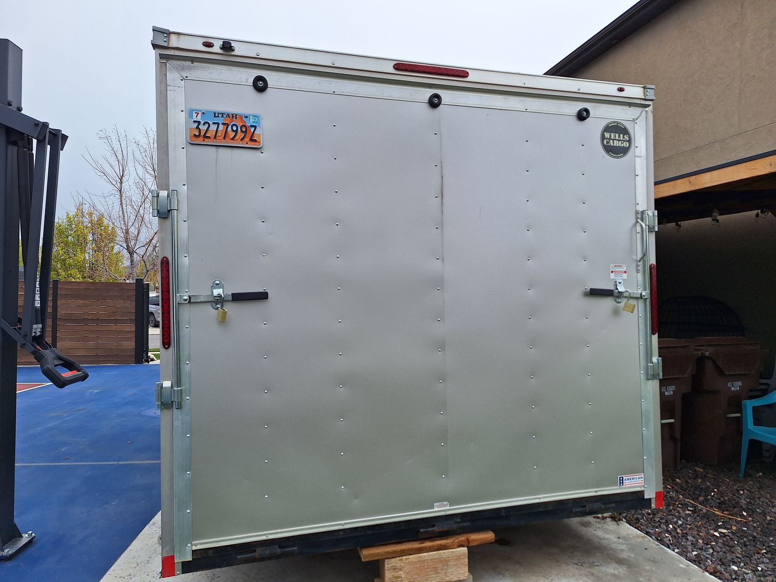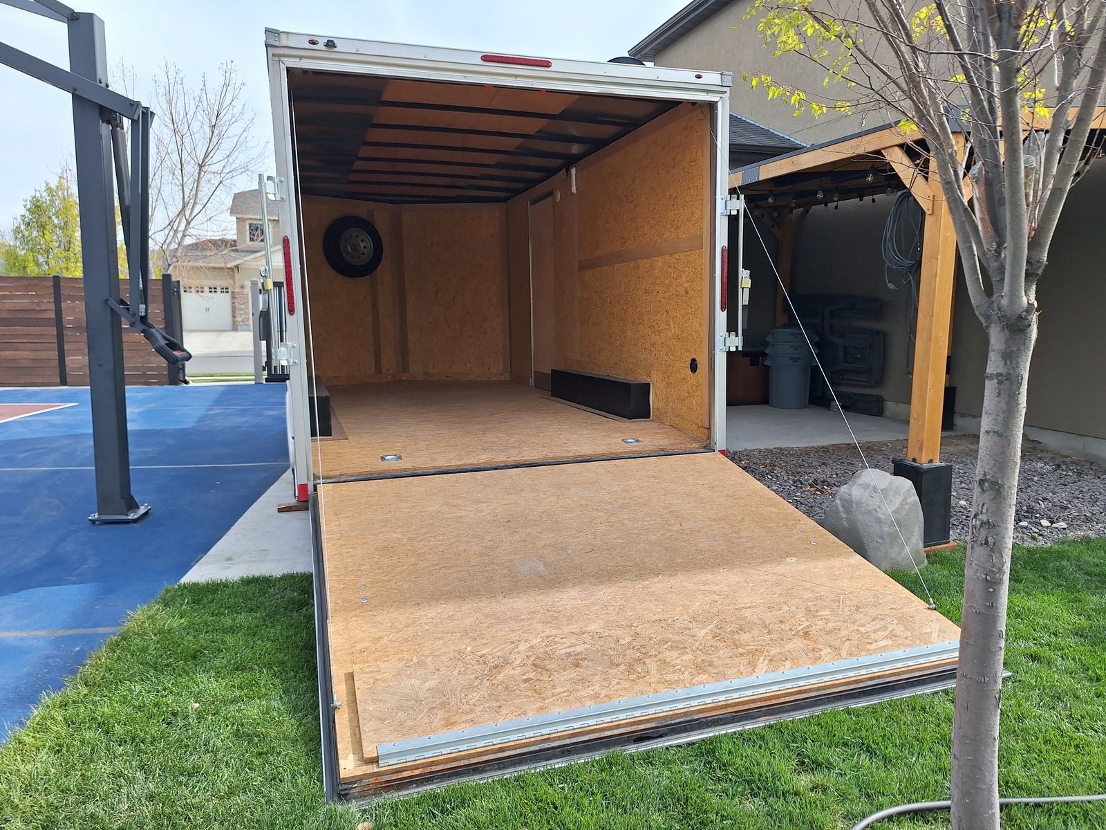 Includes; Spring assist rear ramp. Internal tie downs on the floor. Internal battery powered lights. Foot and wheel attachments for the tongue. Four jack stands and a jack box. Wheel covers and wheel chocks. Hitch with 2 5/16 ball.