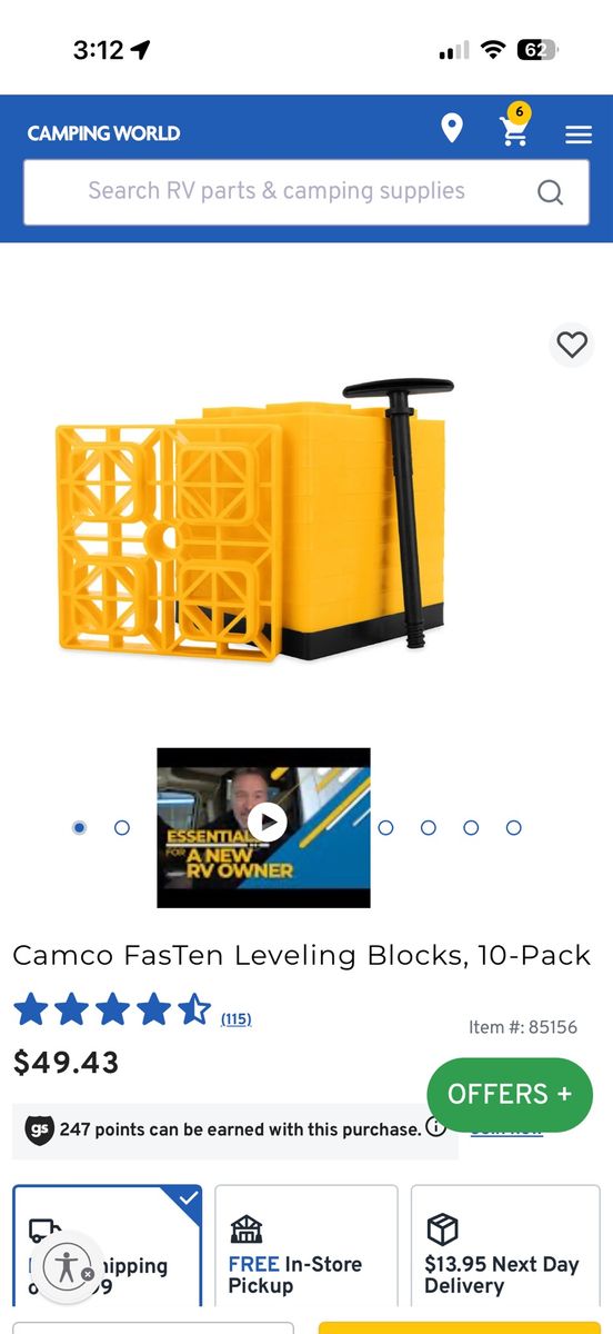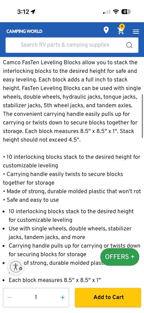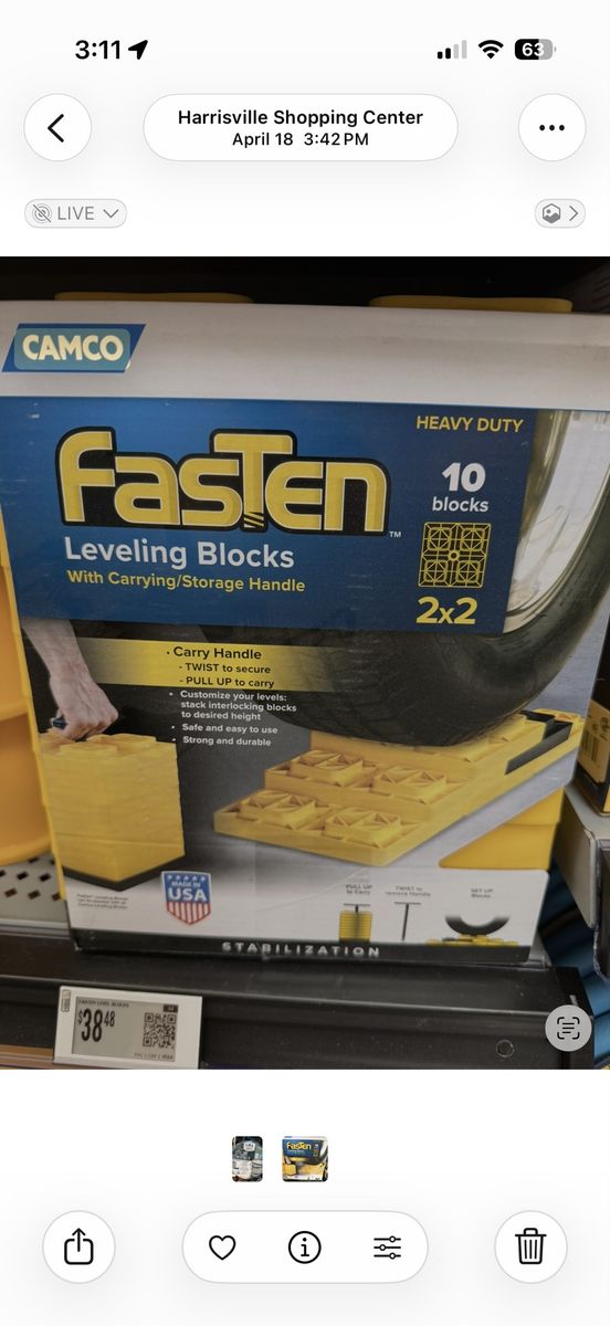 Hardly used. Great Condition. Pretty much like new. Camco FasTen Leveling Blocks allow you to stack the interlocking blocks to the desired height for safe and easy leveling. Each block adds a full inch to stack height. FasTen Leveling Blocks can be used with single wheels, double wheels, hydraulic jacks, tongue jacks, stabilizer jacks, 5th wheel jacks, and tandem axles. The convenient carrying handle easily pulls up for carrying or twists down to secure blocks together for storage. Each block measures 8.5" x 8.5" x 1". Stack height should not exceed 4.5".