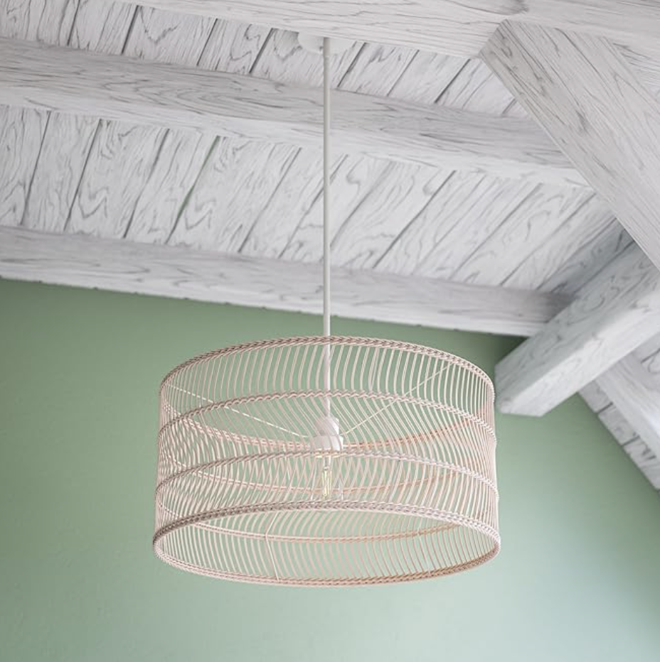 Light and airy rattan drum pendant White hardware and rope rattan shade Ideal for use with a clear or Edison style bulb Vaulted and sloped ceiling compatible Hardwired fixture includes mounting hardware, electrical wire, and clear instructions for quick and easy installation Complements natural modern, biophilia, light and airy, and coastal home decor Requires 1-100 Watt Maximum Medium Base Bulb or LED Equivalent