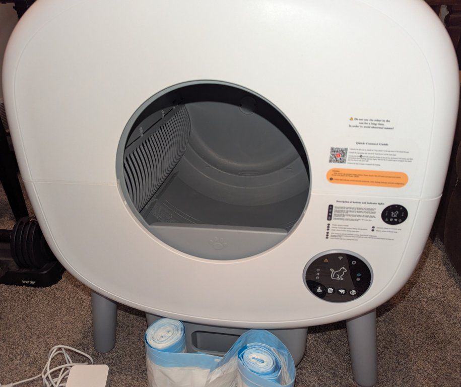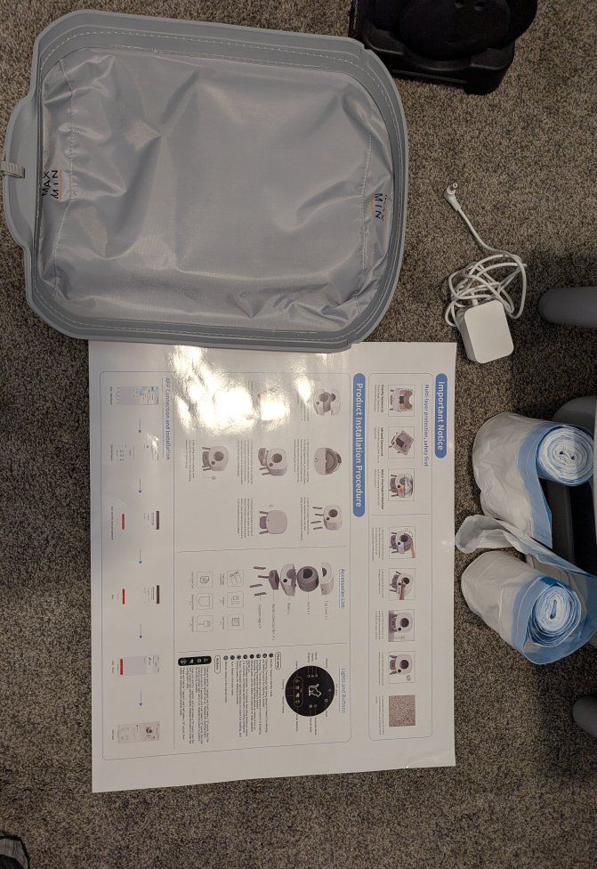 VenmoI got this for my cat a few months ago, she doesn't use it much and prefers a regular not automatic litter box. It comes with all the pieces the instruction manual, two brand new liners, almost two full rolls of trash bags for the holder underneath, and the cord. It uses any type of litter. We just deep cleaned it and it works great. It's pretty heavy so you can take it in it's separate pieces or altogether. We don't have the box it came with. Starting price $165 for the litter box and everything else but best offer.
