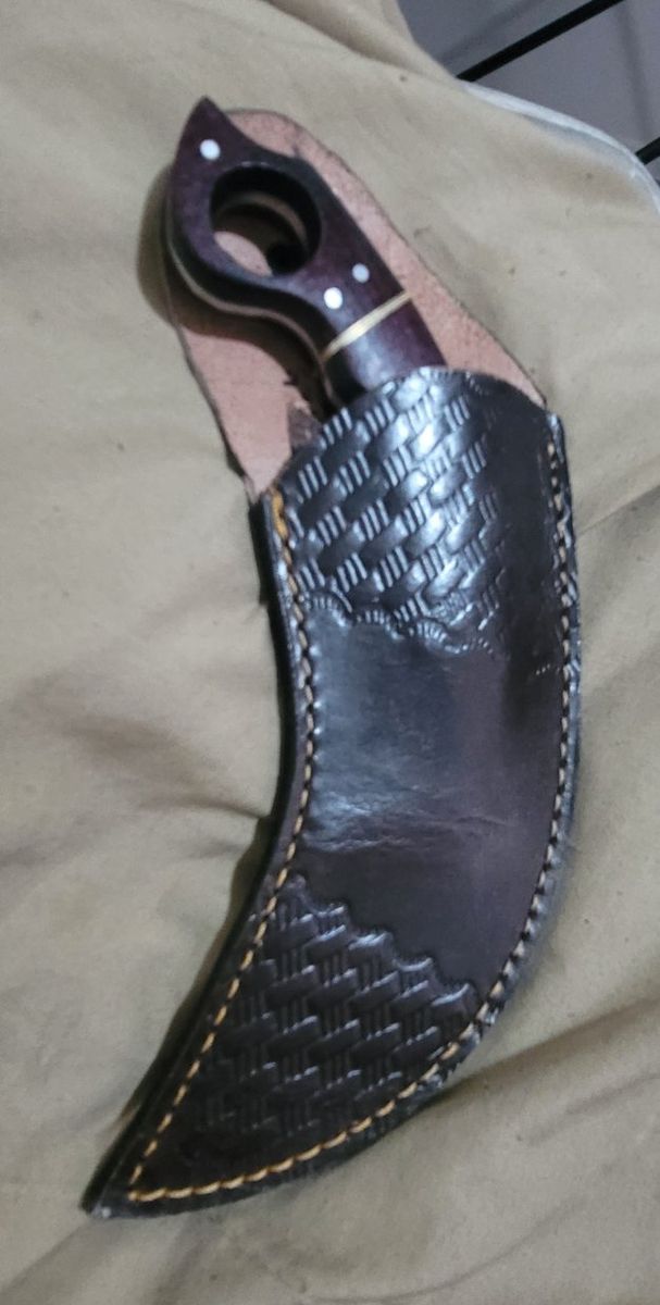 PayPala Damascus steel kerambit knife with a leather sheath.