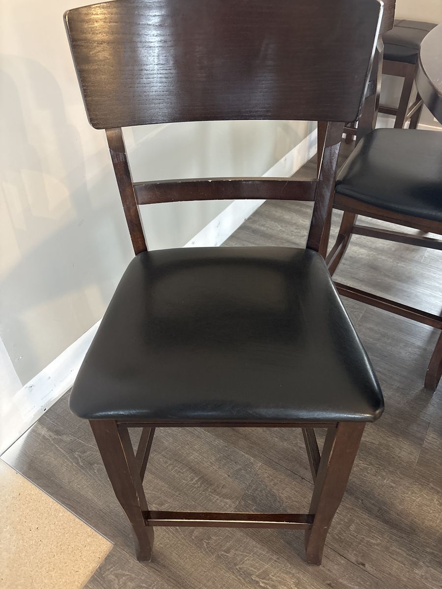 Comes with 6 matching chairs that are sturdy and comfortable. There is some normal wear from use, and a bit of the leather has peeled on a few chairs, but everything is still in solid, usable condition.