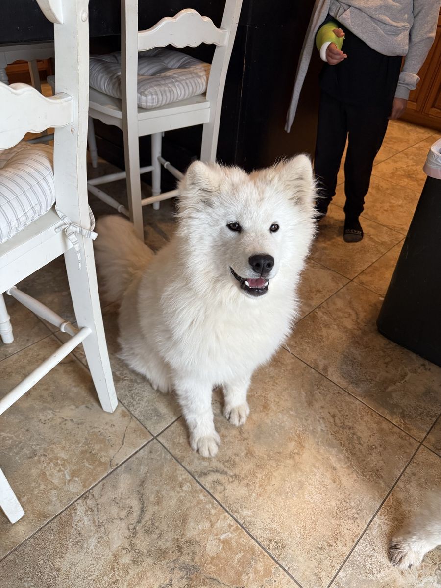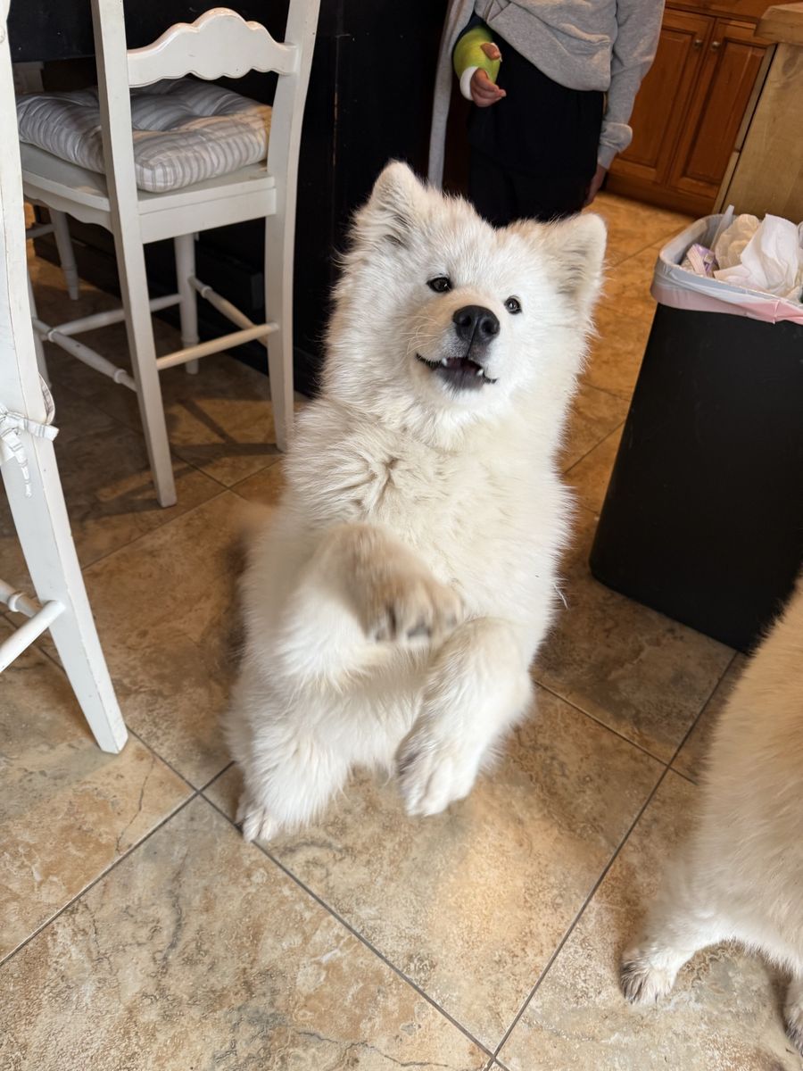 She is a female Samoyed puppy born in November. She is a pretty good dog! I have taught her most basic commands like sit, lay, high five, sit pretty. She does occasionally potty when she gets scared in the house if she isn’t let out enough but she is really good at this for the most part. She is very energetic and loves to cuddle! She does great with kids, dogs, and cats. Still so young to teach her more! She is not fixed. I will admit she has her own “graveyard” where she loves to collect items from the house 🤣. She is a purebred but she is not AKC registered. I have all the paperwork you need! Please let us know if you are interested