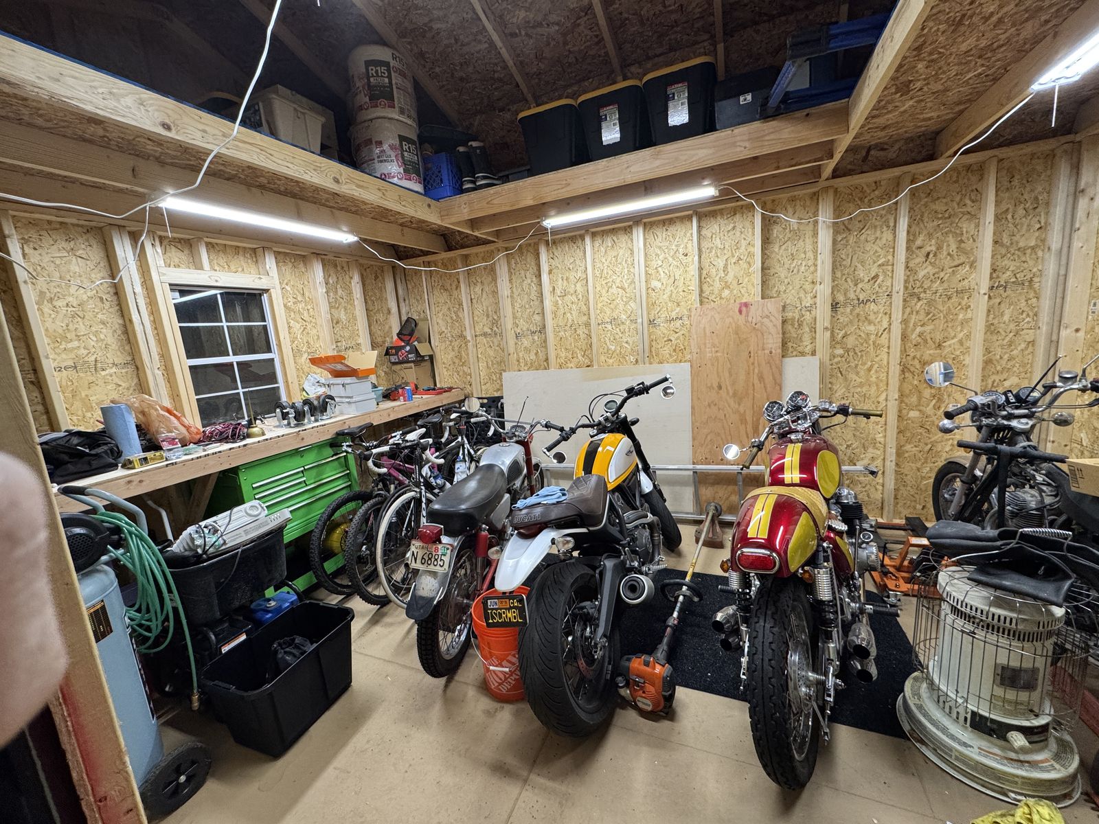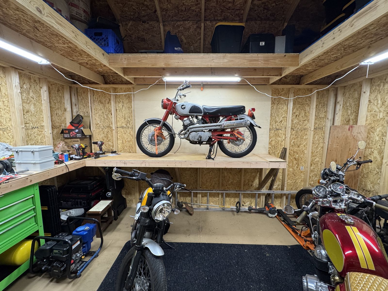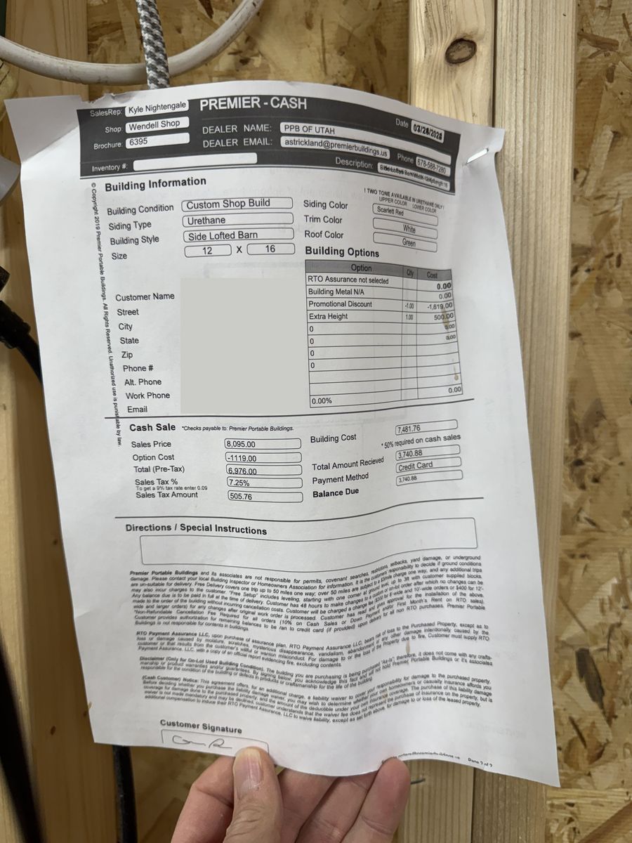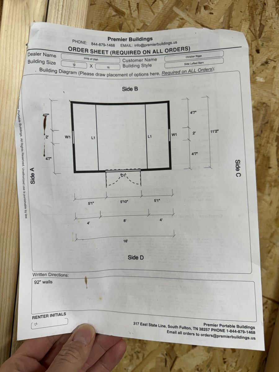 12' x 16' tall with 3-sided lofts for extra storage. Strong and sturdy built-in workbenches, lighting included. Includes the ramp. Also all material for a 16' deep, 8' wide lean-to off the backside (metal roofing and lumber to build, aside from the posts). Includes the ladder for loft access.