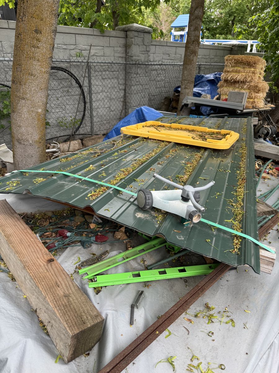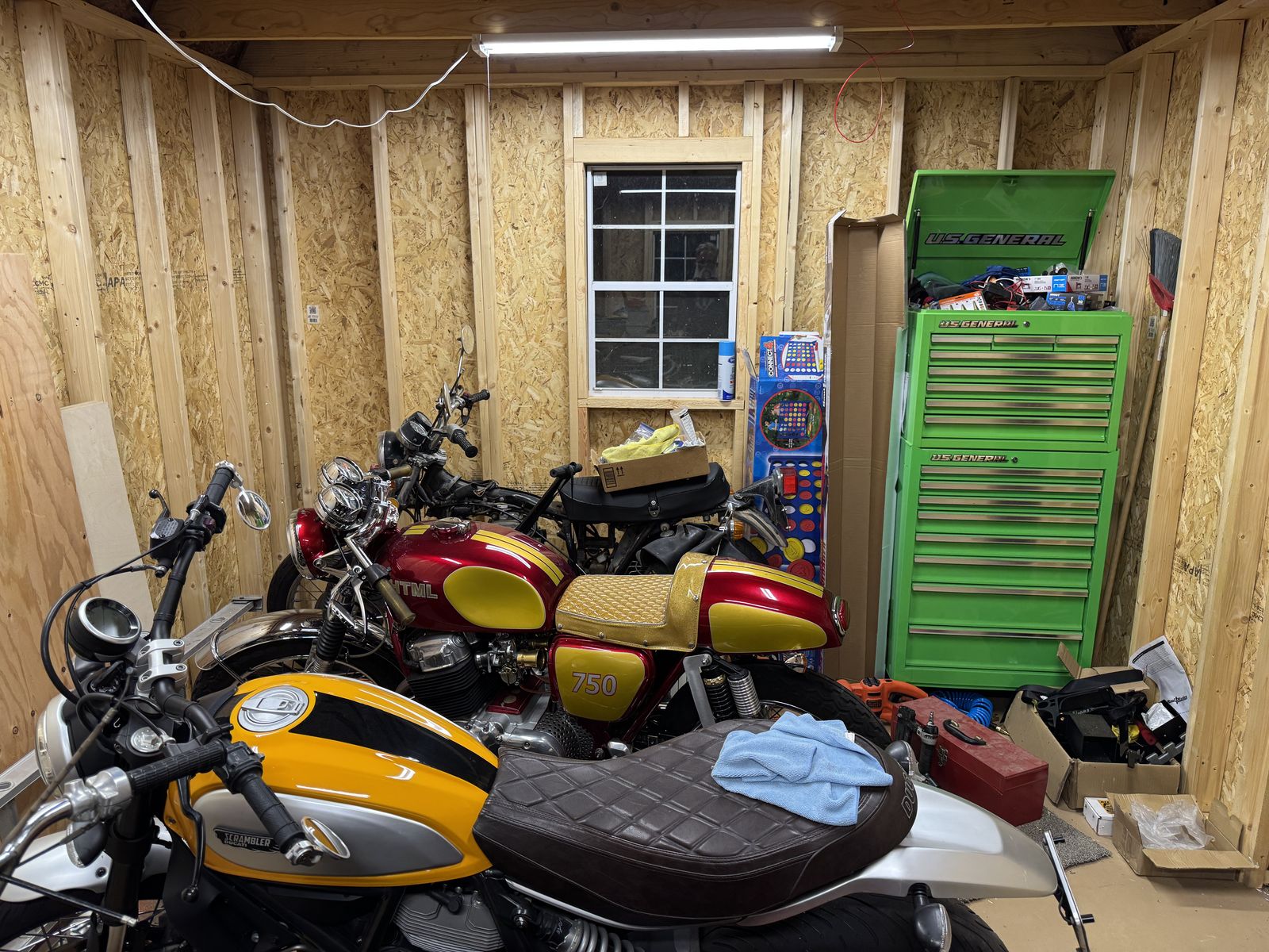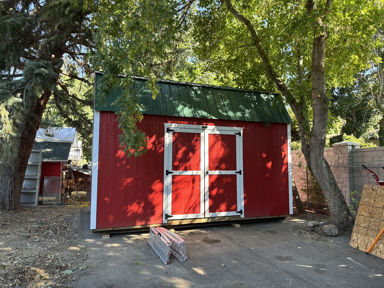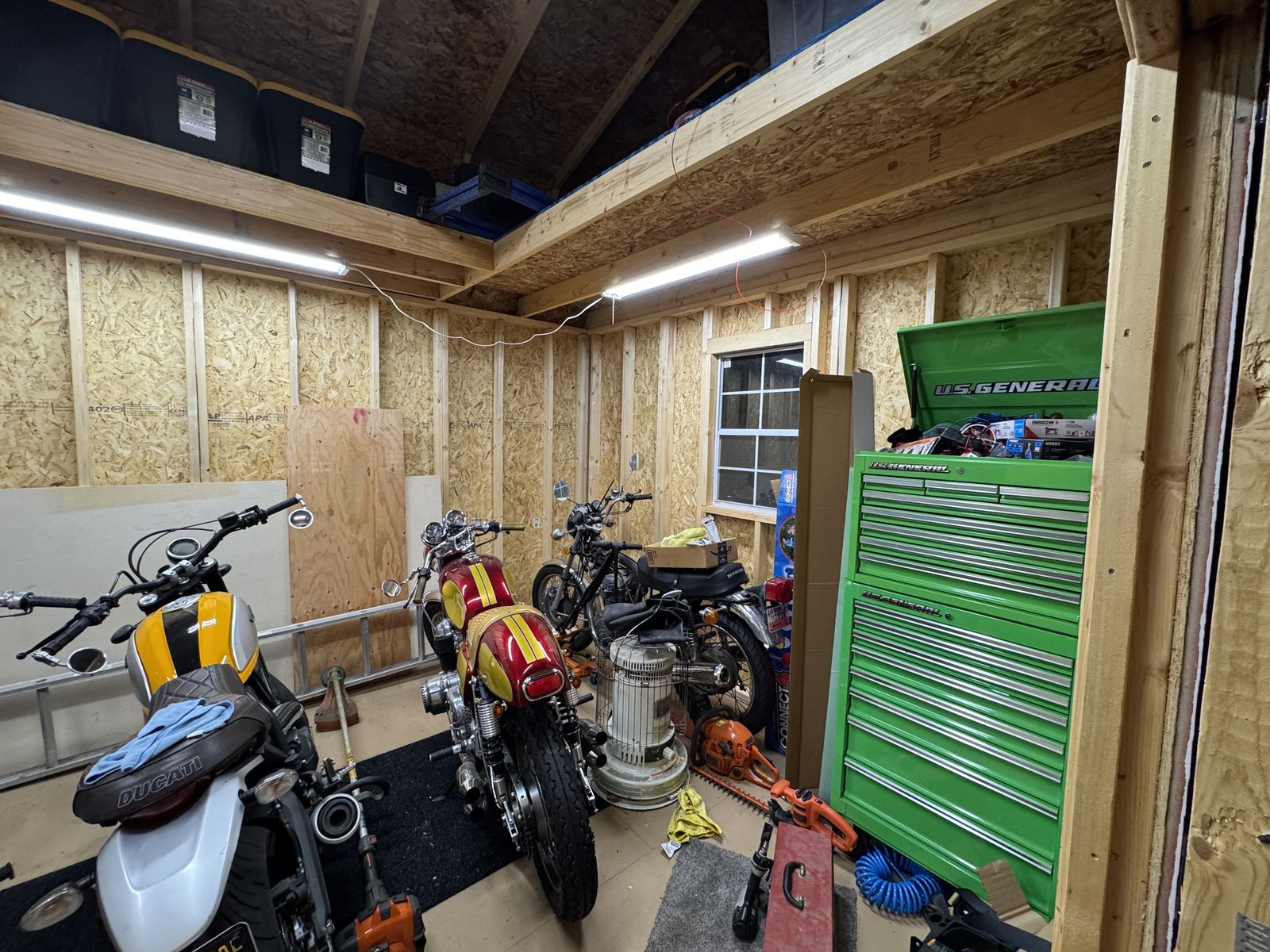12' x 16' tall with 3-sided lofts for extra storage. Strong and sturdy built-in workbenches, lighting included. Includes the ramp. Also all material for a 16' deep, 8' wide lean-to off the backside (metal roofing and lumber to build, aside from the posts). Includes the ladder for loft access.