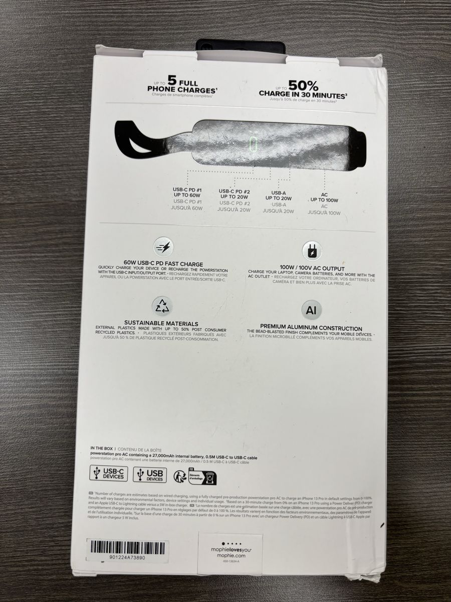 VenmoMophie Powerstation Pro AC is a high-capacity 27,000mAh portable power bank designed to charge multiple devices simultaneously, including power-hungry electronics like laptops. It features a unique 100W AC outlet alongside three USB ports (one 60W USB-C PD, one 20W USB-C, and one 20W USB-A), allowing it to output up to 140W of combined power.