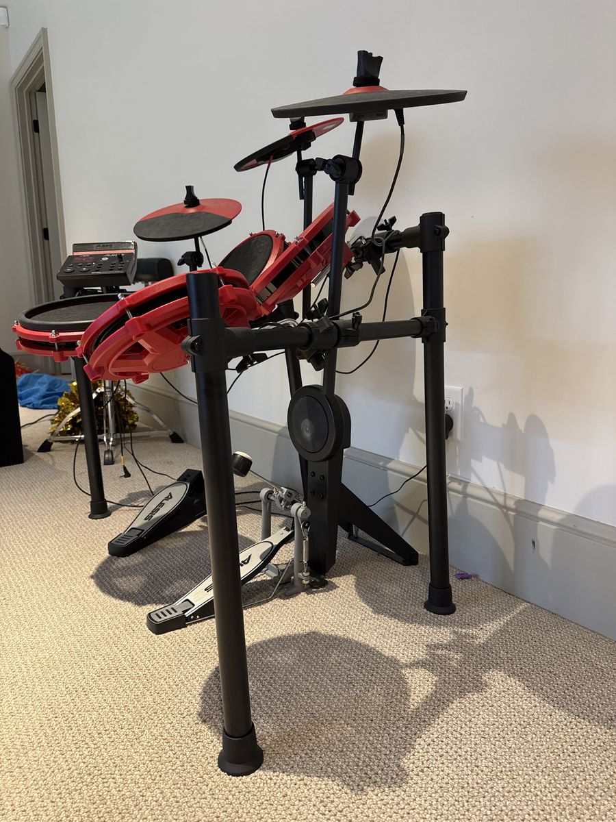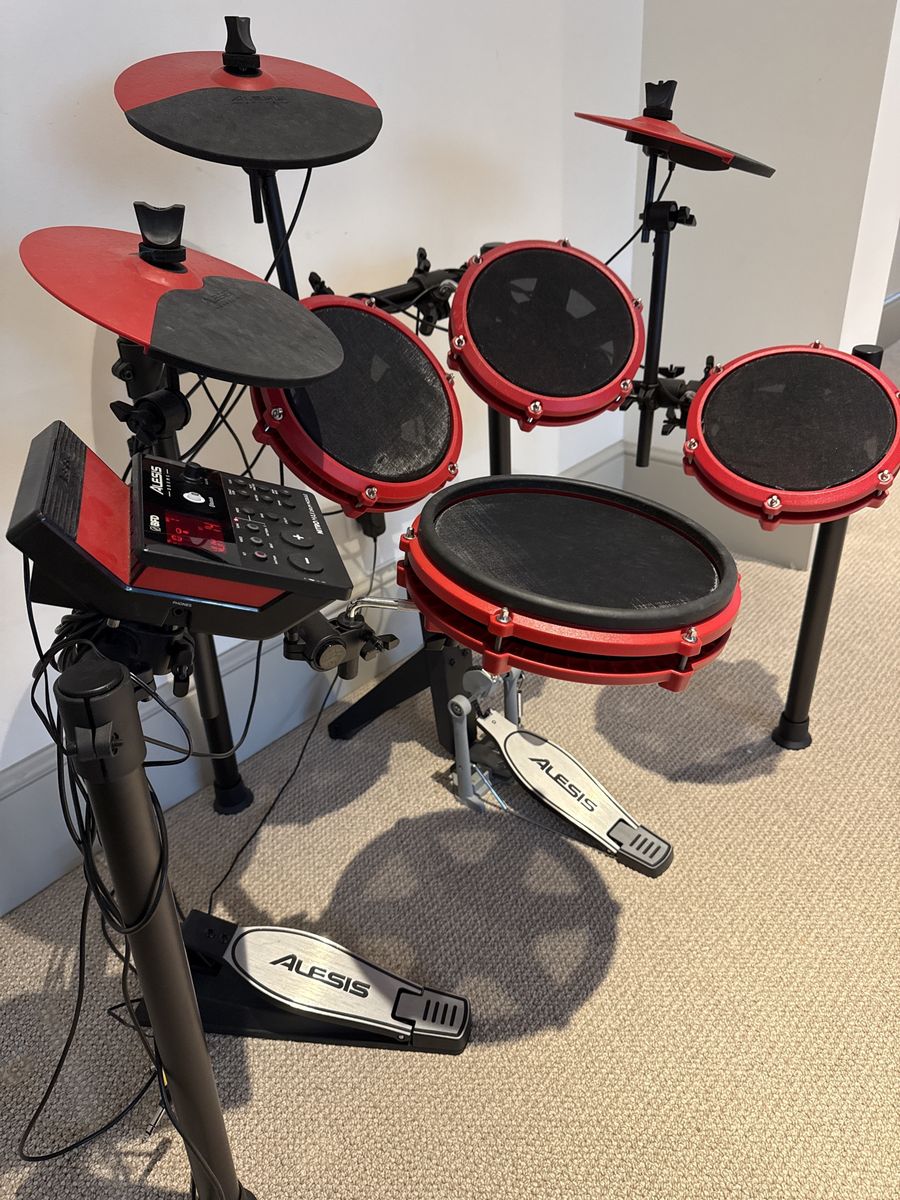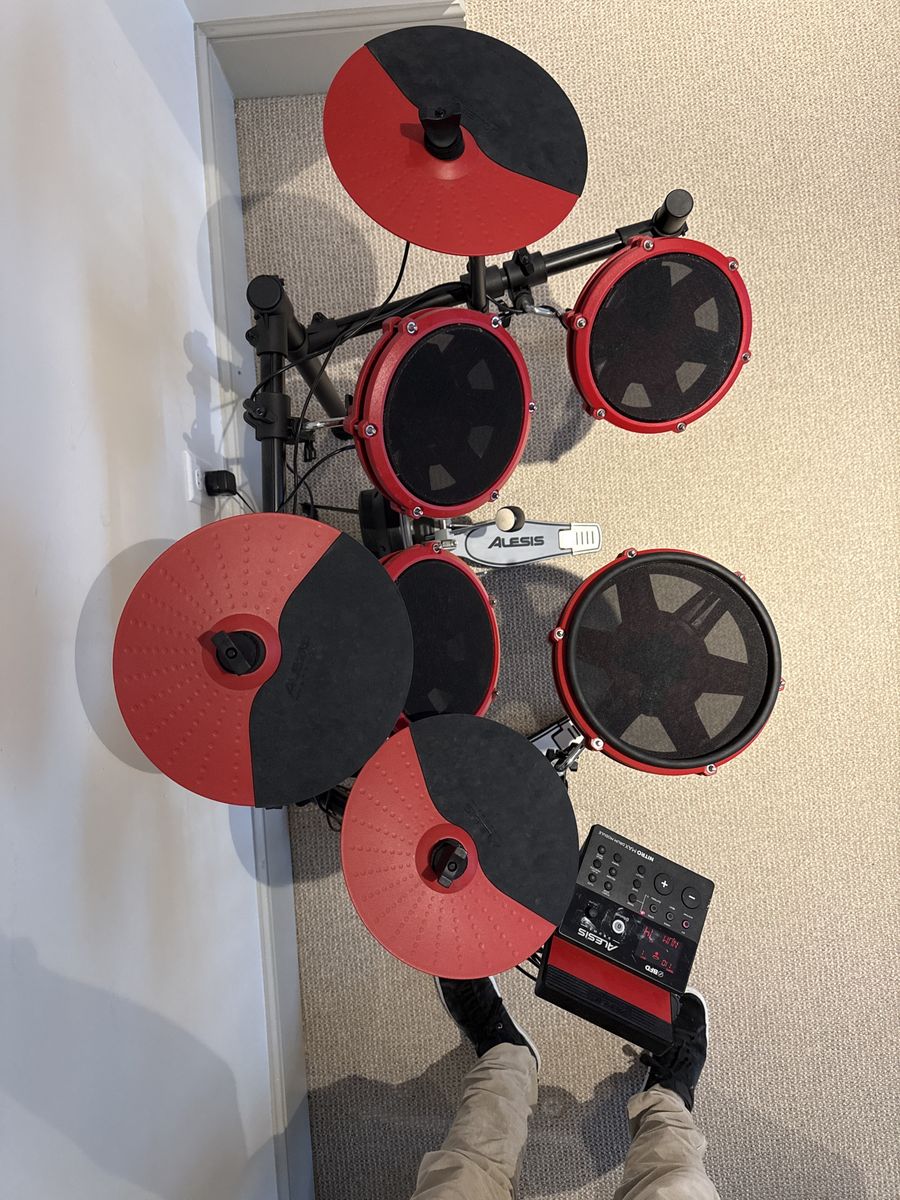 ApplePayAlesis Nitro Max Electronic Drum Kit – Red | 8-Piece Mesh Kit Great beginner/intermediate e-kit in good condition. Mesh heads are quiet enough to play in the house without disturbing anyone. Sounds great through headphones or speakers. Includes:\