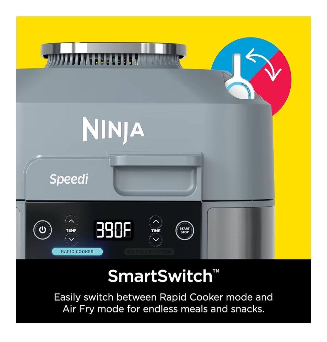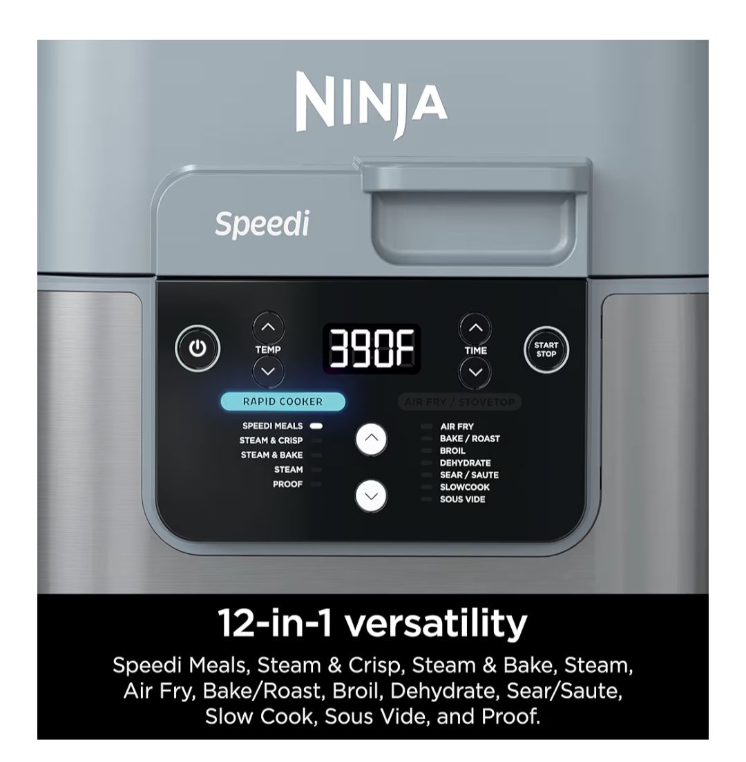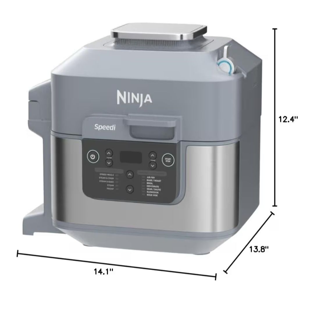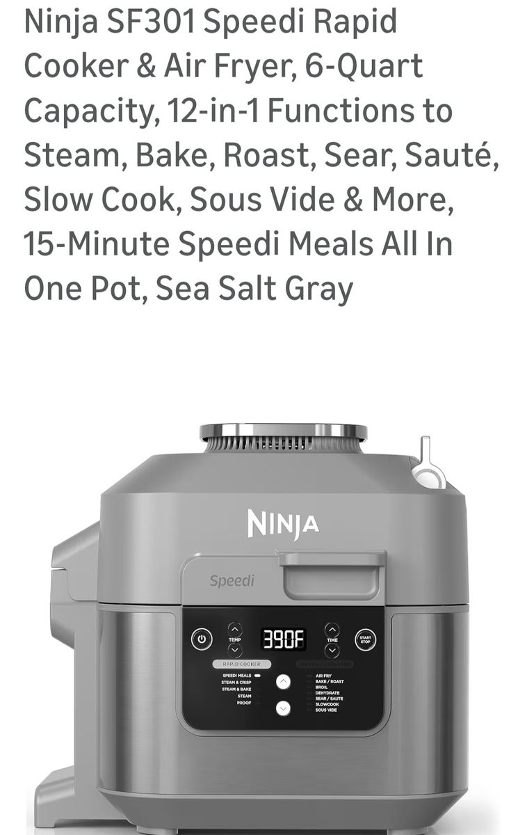 Brand new, never been used: "Ninja SF301 Speedi Rapid Cooker & Air Fryer, 6-Quart Capacity, 12-in-1 Functions to Steam, Bake, Roast, Sear, Sauté, Slow Cook, Sous Vide & More, 15-Minute Speedi Meals All In One Pot, Sea Salt Gray". $75.00 obo.