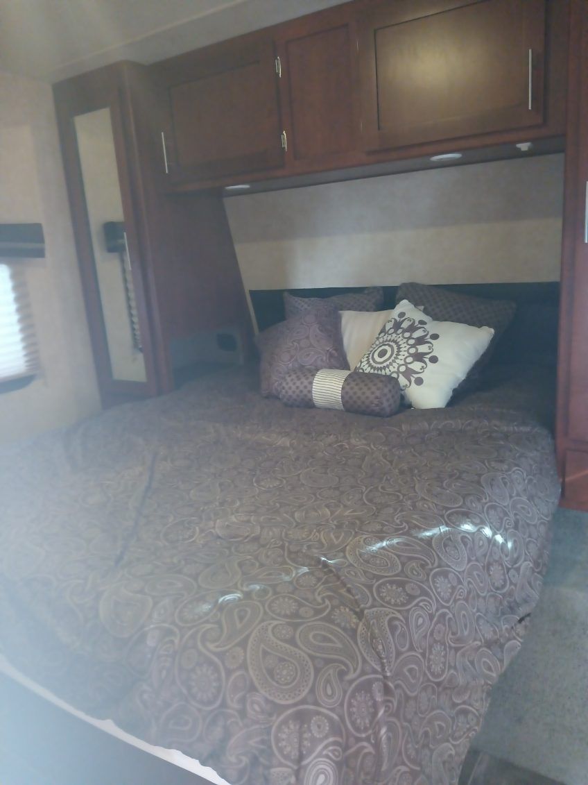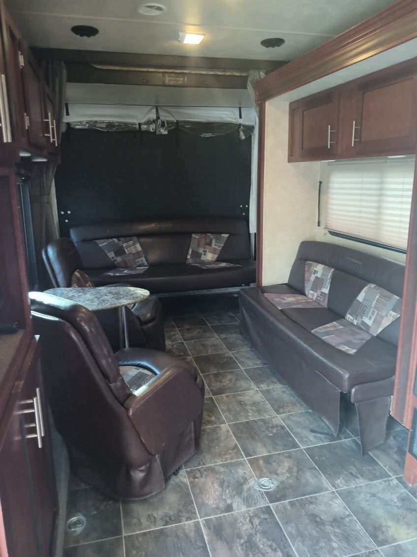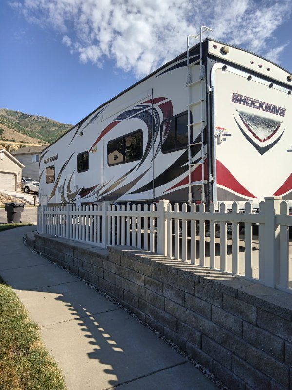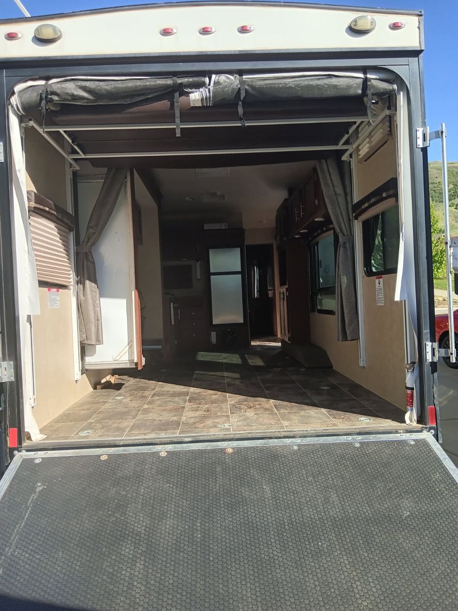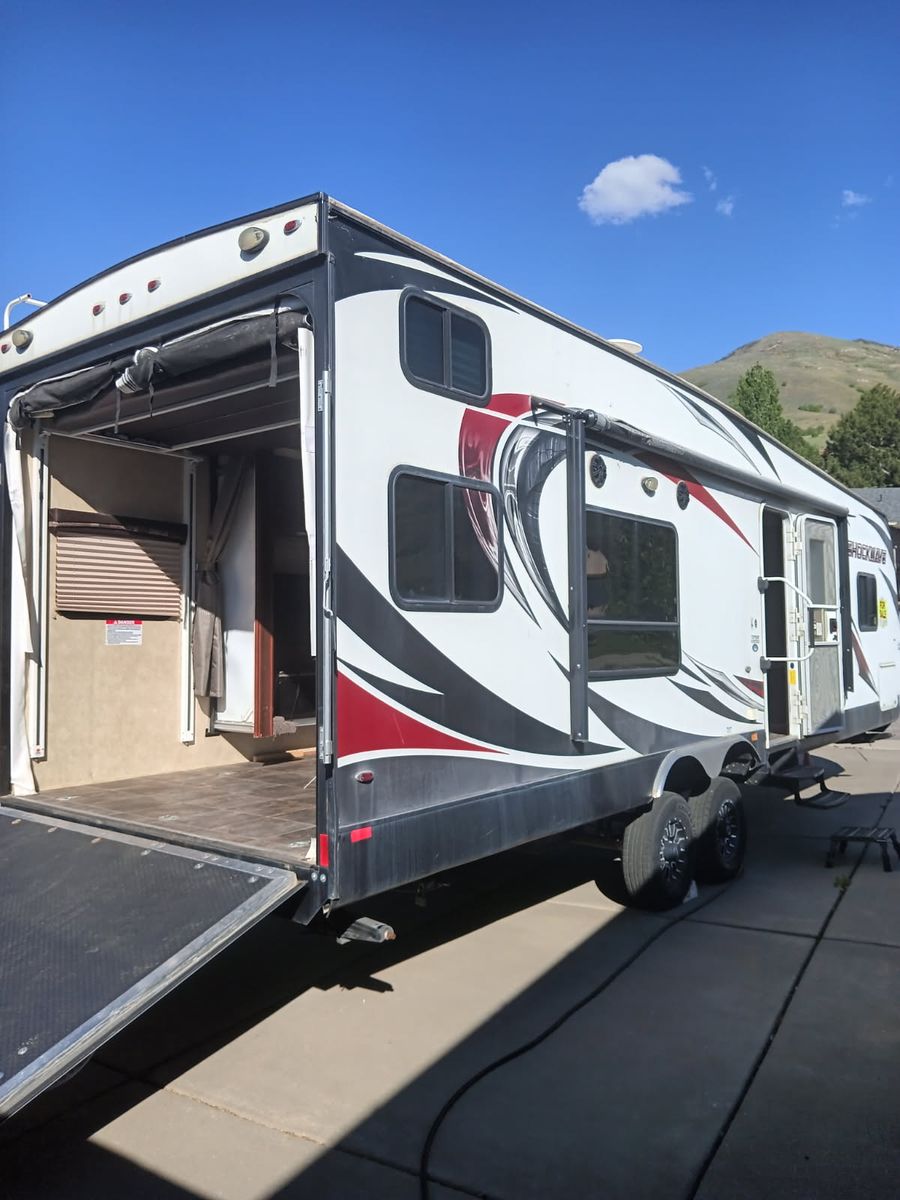 2016 Shockware 32' Toy Hauler. Winter package, Hydronic water heating system, microware/hood combo, 4 cu refrigerator and freezer, gas grill top and oven, central/ducted air conditioning, furnace, fuel station, flat screen tv, slide-out awning, cabinetry upgrade, solar battery charger, power slide-out room, cummins RV 4000 generator, Power lift for bunk beds.