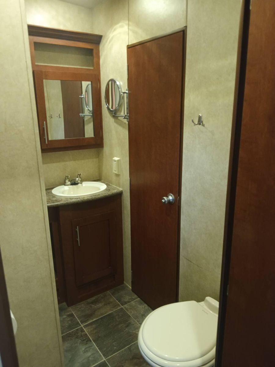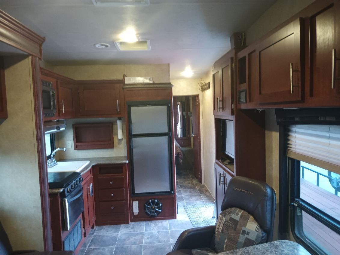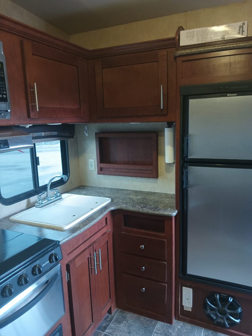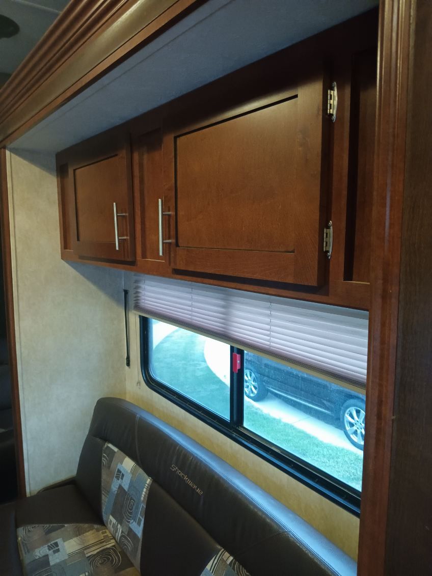 2016 Shockware 32' Toy Hauler. Winter package, Hydronic water heating system, microware/hood combo, 4 cu refrigerator and freezer, gas grill top and oven, central/ducted air conditioning, furnace, fuel station, flat screen tv, slide-out awning, cabinetry upgrade, solar battery charger, power slide-out room, cummins RV 4000 generator, Power lift for bunk beds.