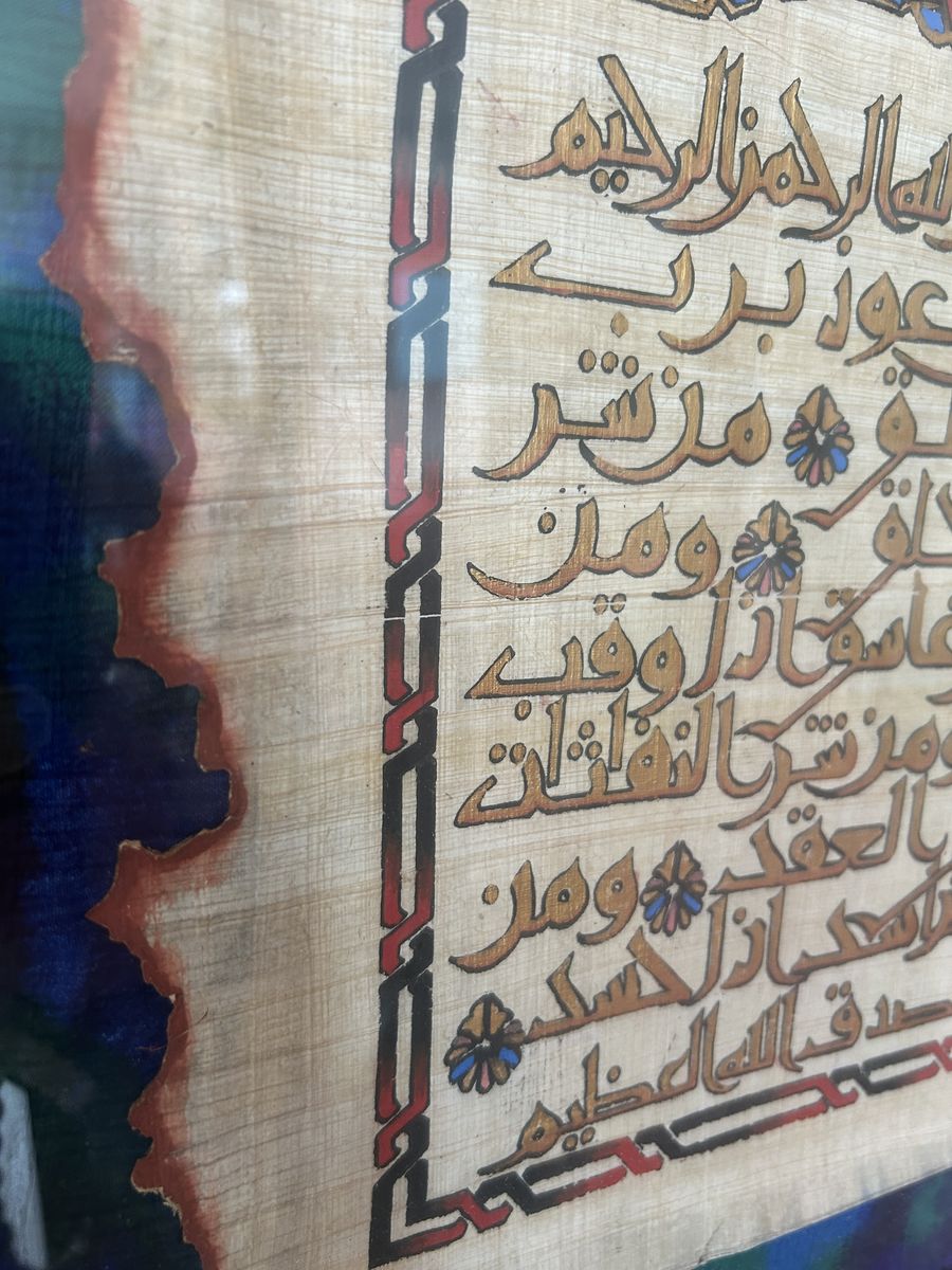 Set on a papyrus-style background with a colorful layered backing, which gives it a unique look compared to standard prints. The texture of the papyrus and the hand-finished feel make it stand out nicely. Papyrus-style artwork inspired by traditional Middle Eastern pieces.