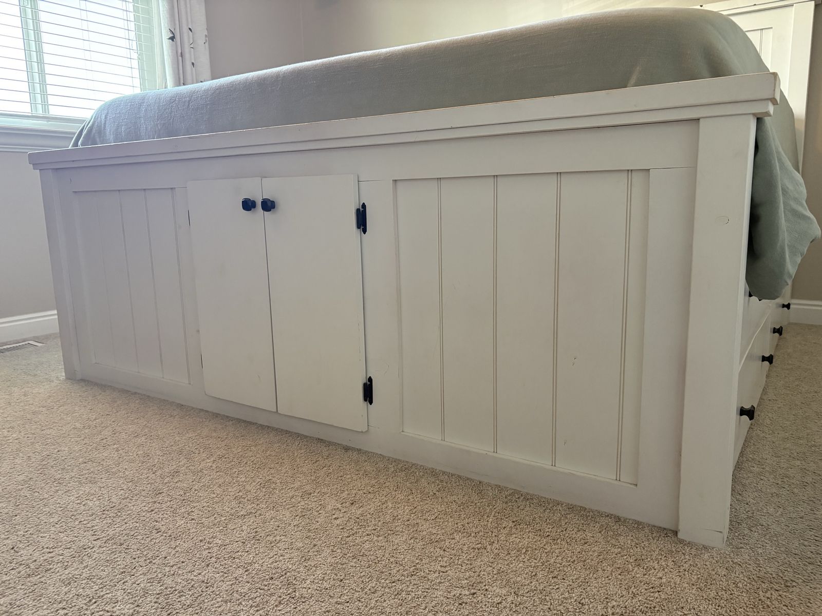 Measurements: Headboard 57’’ tall x 84’’ wide Footboard 31’’ tall x 84’’ wide Side rail height (where drawers are) 25’’ Overall length 87’’ Each drawer is approximately 8’’ deep x 32’’ wide Access opening is 20’’ x 22’’