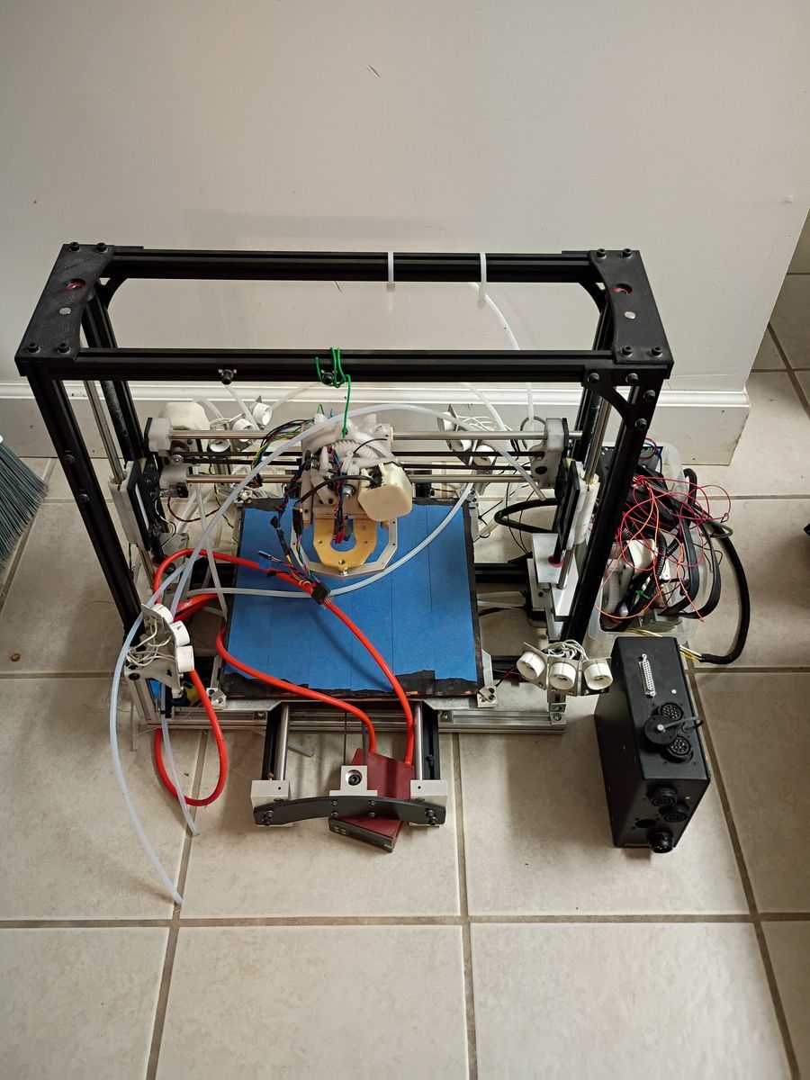 The Taz 4 is heavily modified. The modifications were an attempt to upgrade the printer to extrude ULTEM and PEEK filaments. So, it has a number of heat lamp housings (I still have the bulbs if they're wanted), an airline cooling system (motor housings, a manifold, various hoses, etc.), high temperature hot ends, and a high temperature heat bed (I don't recall how hot it goes, but much hotter than a typical bed). Many of the parts were reprinted with Polycarbonate and Ultem to withstand teh high temperatures. It should be able to print with a little bit of tinkering.