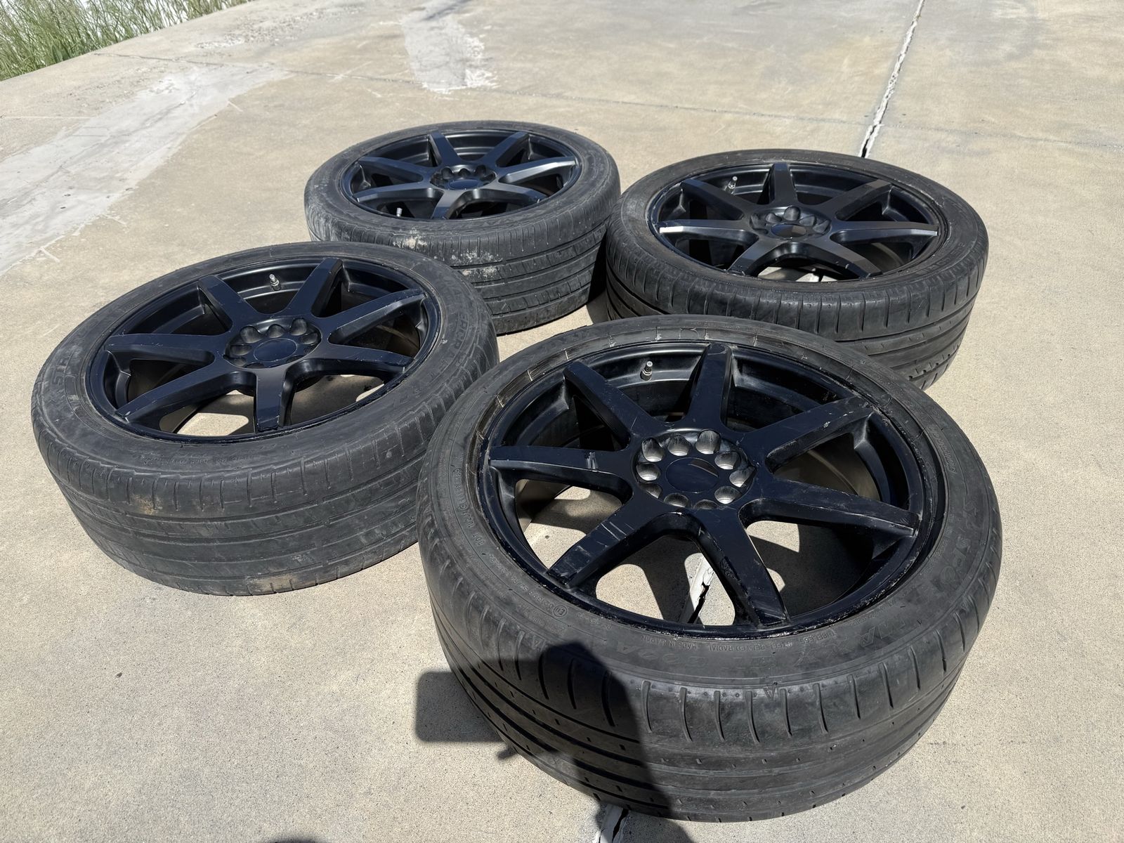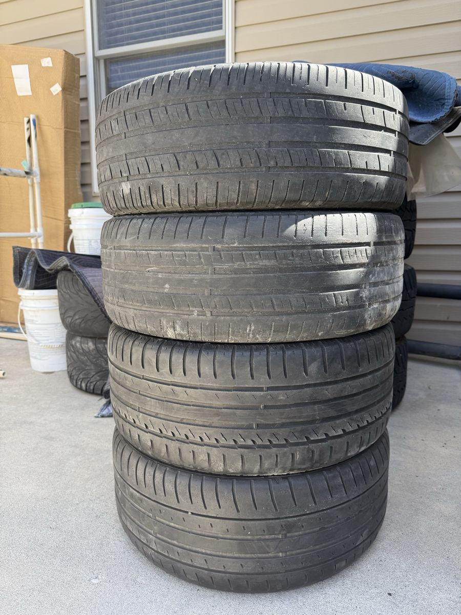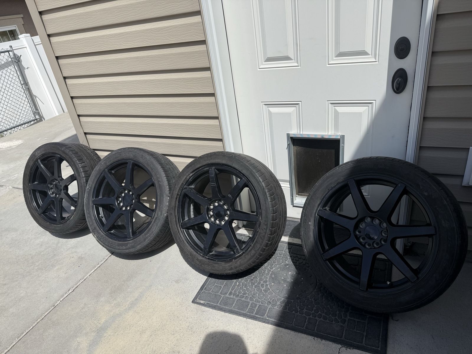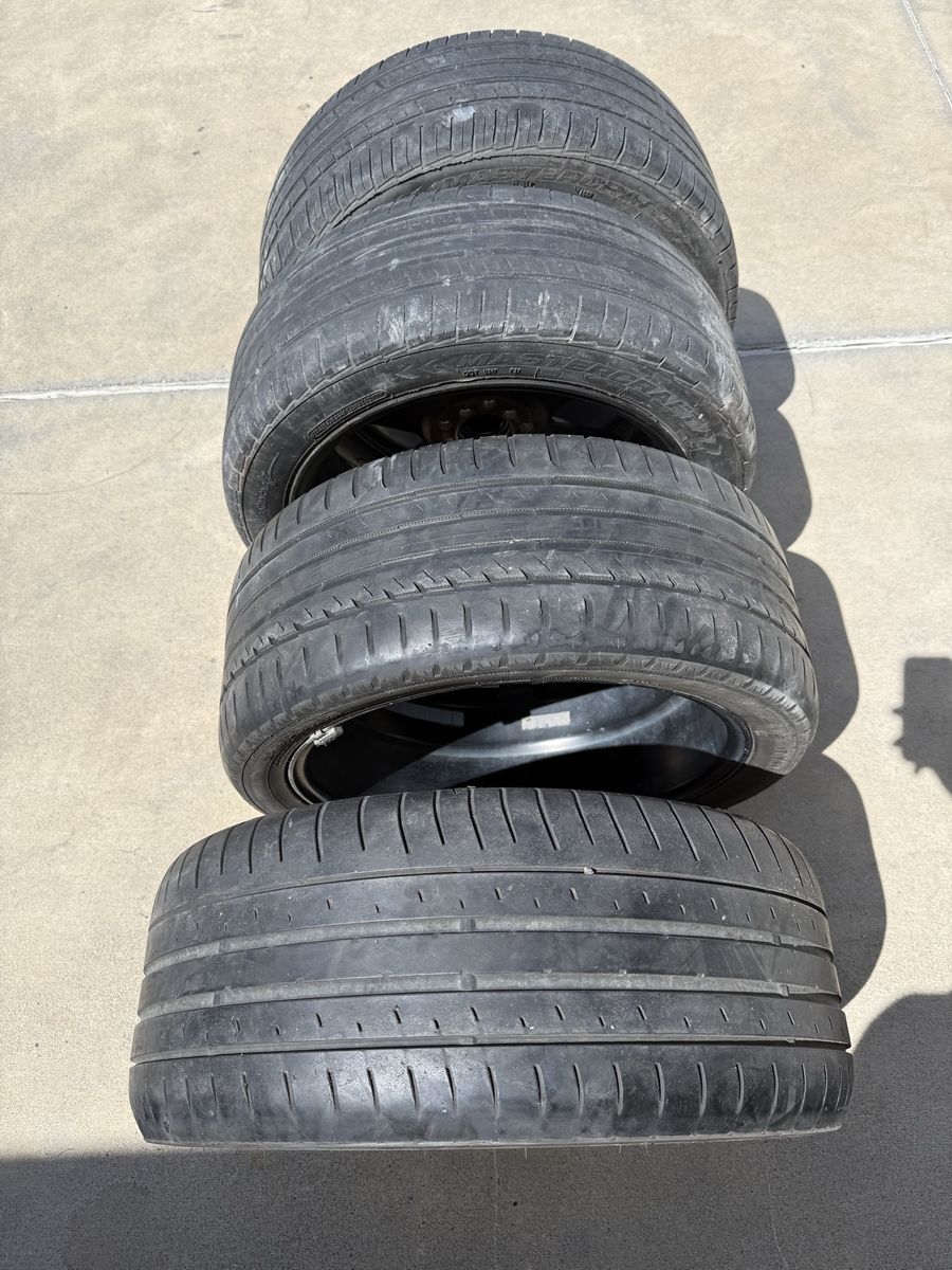 -Clearing up space so up for grabs. Universal Wheels/Tires, minor curb rash but nothing major. MasterCraft A/T Tires with decent amount of tread remaining. Will also be including 2 spares. Specs -Raceline 131B EVO Wheels -18x7.5+42 (All around) -2x 225/45/18 (Fronts) -2x 245/45/18 (Rears) -2x 245/45/18 (Spares) -5x100 -5x114.3 (Lug Pattern)
