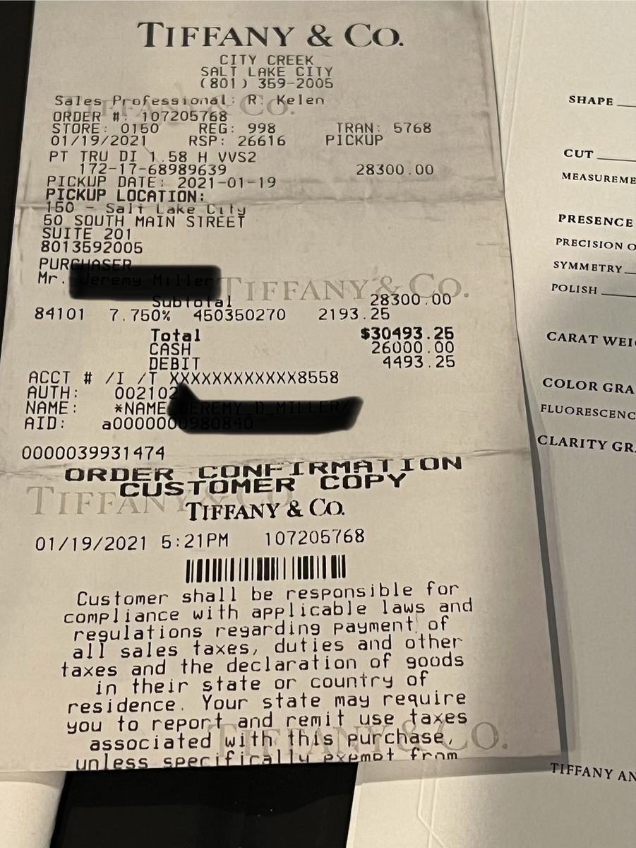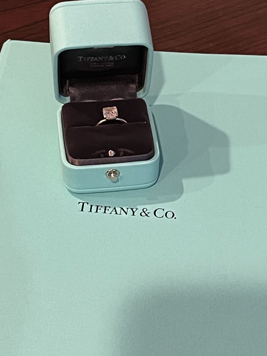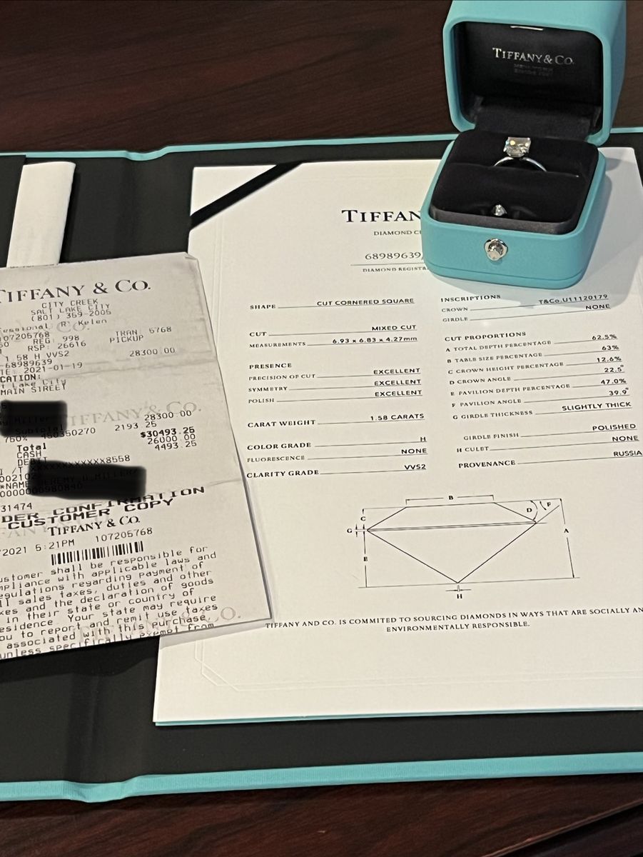 ZelleI bought this in the SLC downtown Tiffany store for $28,300 before tax. The ring size if 4.5 which you can take and get resized or put in a different setup. This is 1.58 carats, color H, VVS2. Comes with the box, papers and receipt as well as the paperwork to get it insured. I also have the matching wedding band if interested. $14000 OBO.