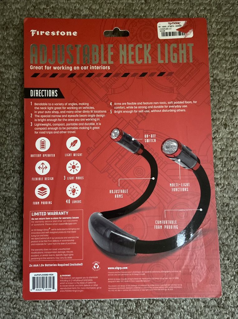 Firestone Adjustable Neck Light. New in packaging. Details on packaging. Must pick up. Cash or Venmo