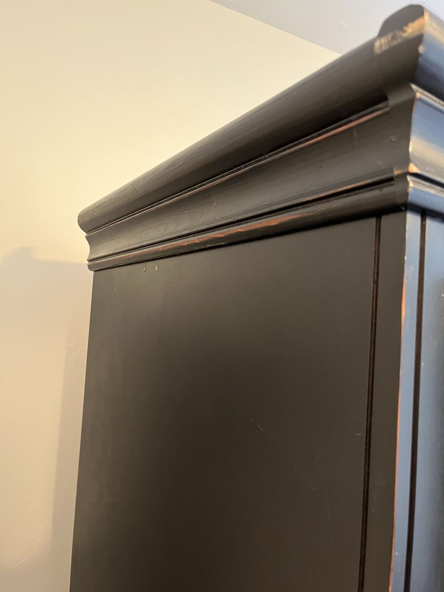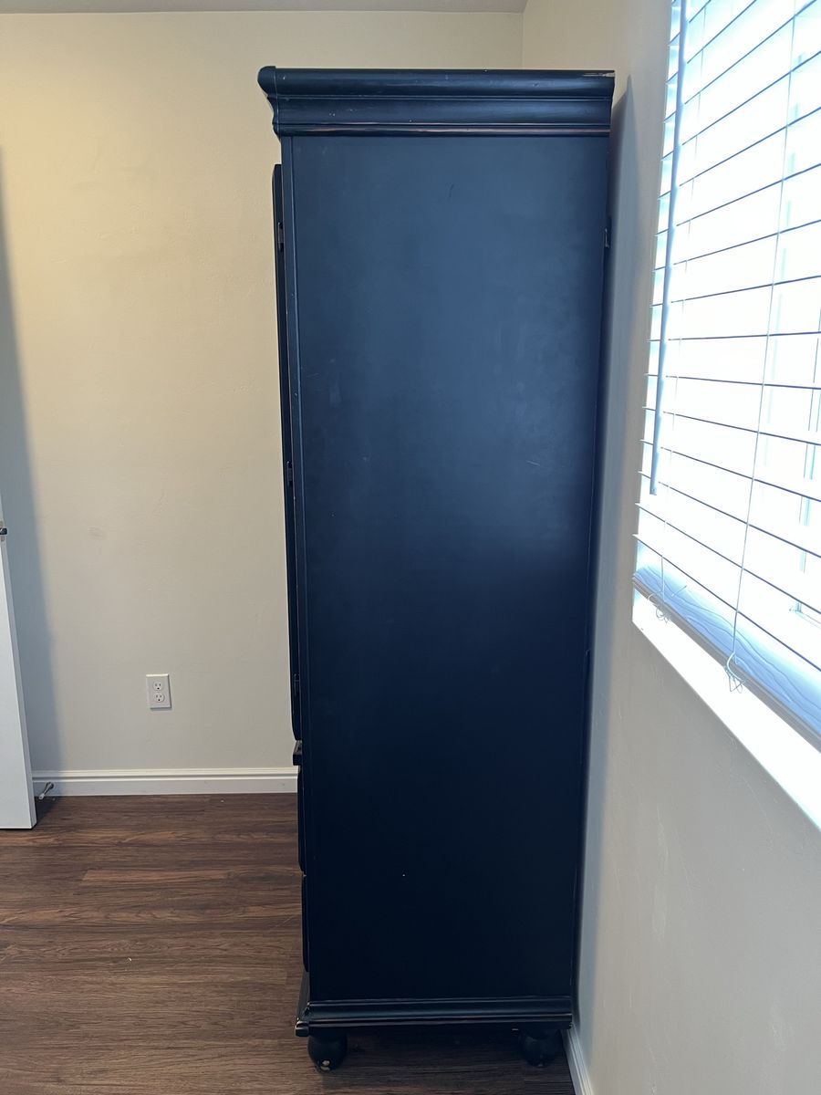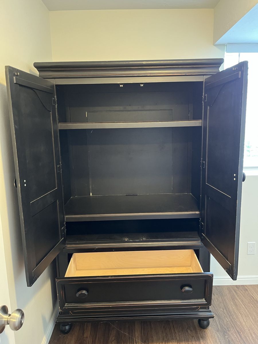 VenmoHeavy, solid build. Has detachable rear wall for tv cords. Only damage are two screw holes (pictured) in left side.