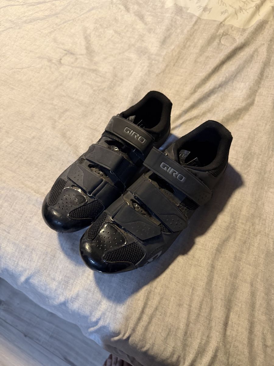 • Giro brand • 3 Velcro strap closure • Stiff sole for efficient pedaling • Compatible with clipless road pedals • Good for beginners or trainer use • Normal wear from use (see pics), still fully functional