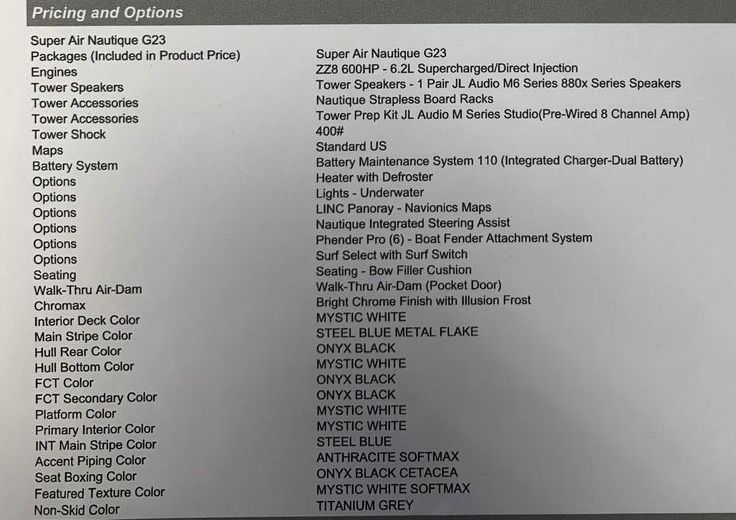 This has been an incredible boat, and is equiped with the "must have" options: ZZ8 600HP 6.2L supercharged motor, and the Nautique steering assist thruster system.
