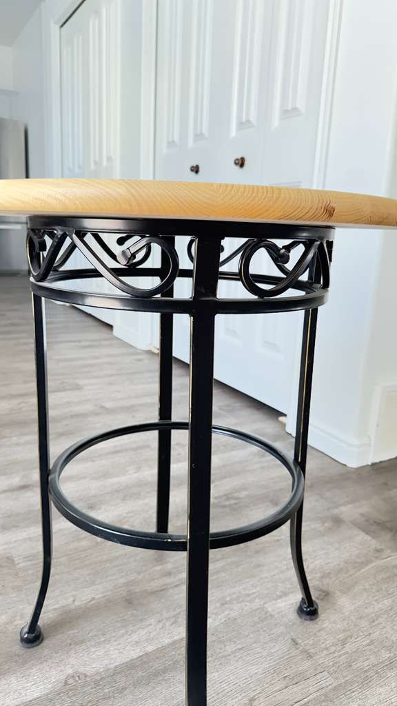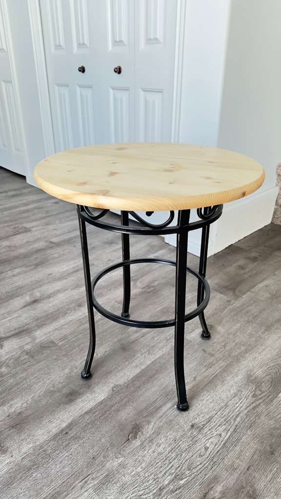 Solid wood top with a natural finish Sturdy black metal base with elegant curved details Perfect size for living rooms, bedrooms, or small spaces Durable and built to last