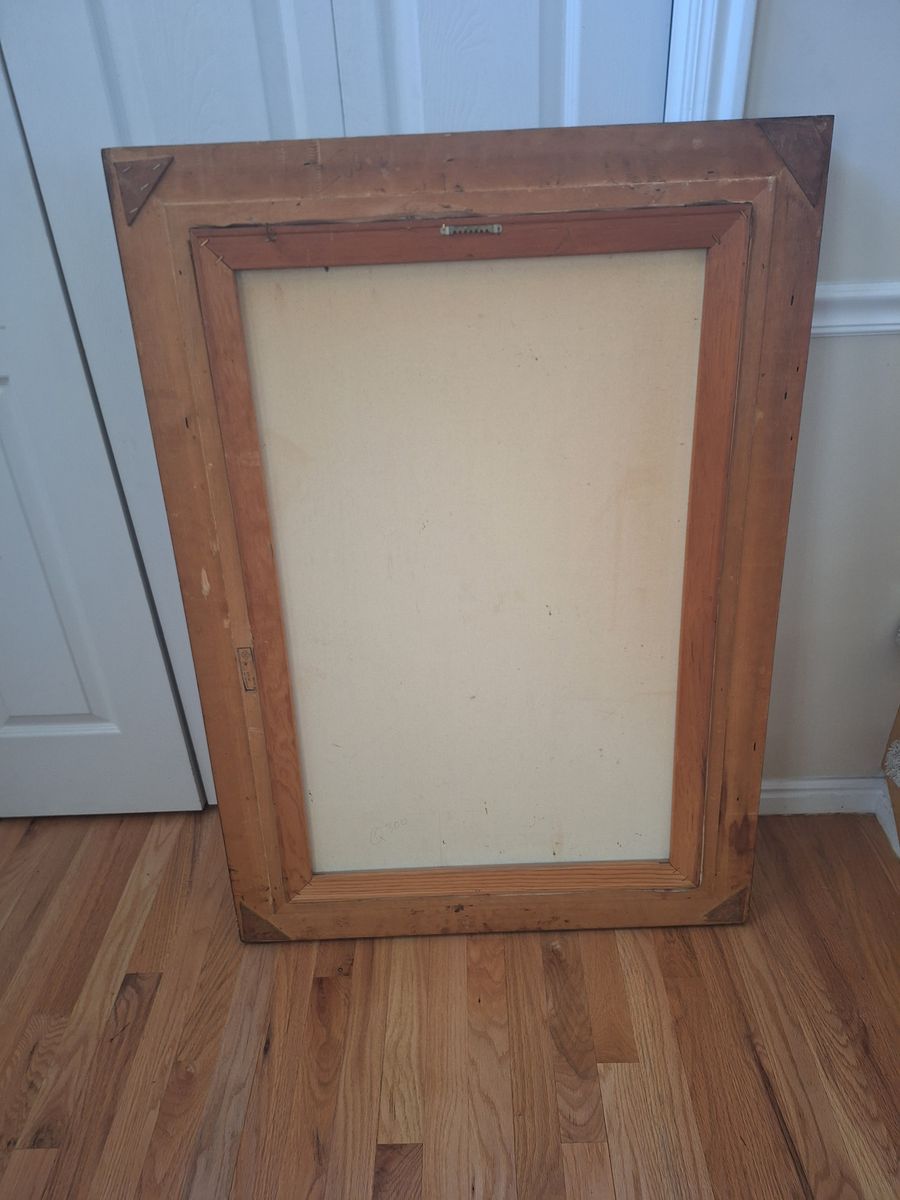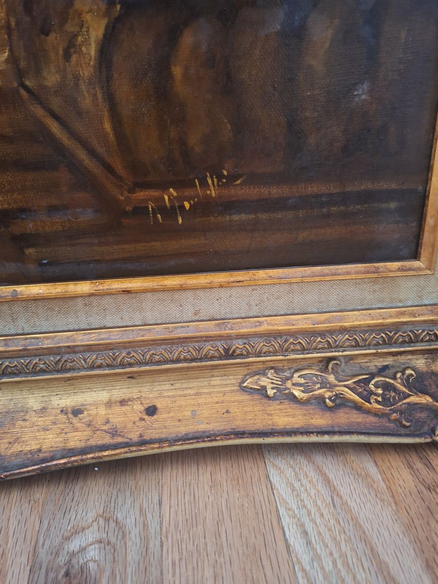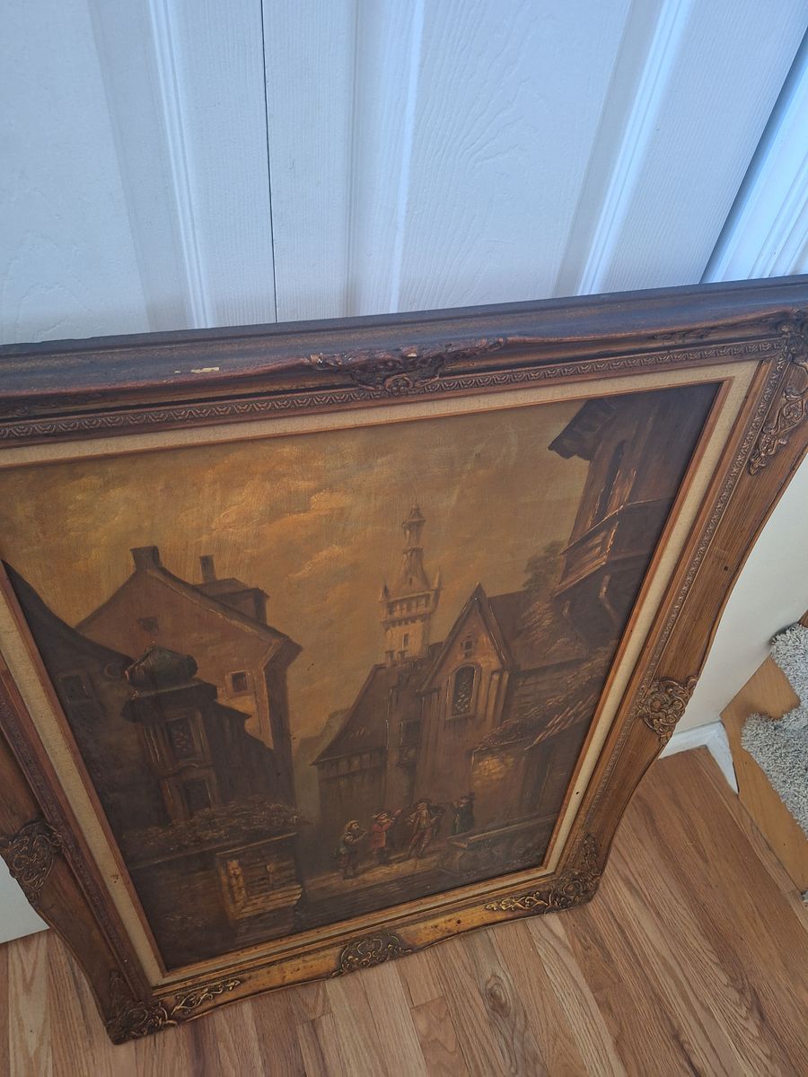 Vintage oil painting, framed in an ornate gilt style, depicts a European town square with figures playing flutes and violin. 30.75" wide x 43" tall. Frame needs work.. Cash only.