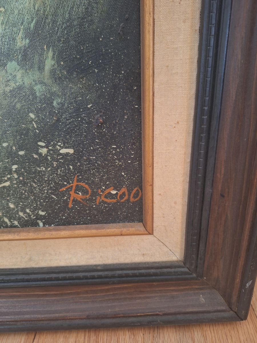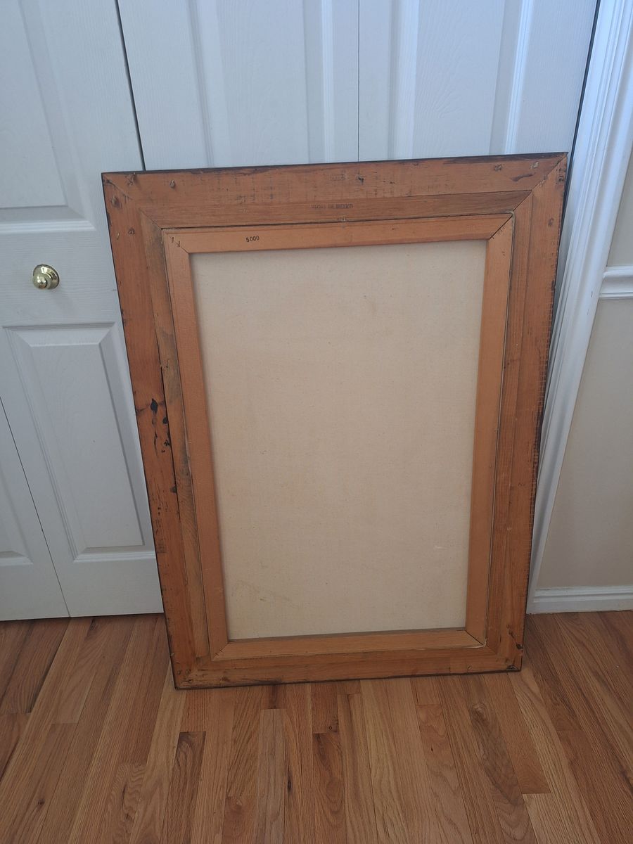 This vintage oil painting on canvas painting, likely depicting an Arizona desert landscape with saguaro cacti and rocky mountains. Length 31.5" wide and 43.5" tall with Frame. Cash only.