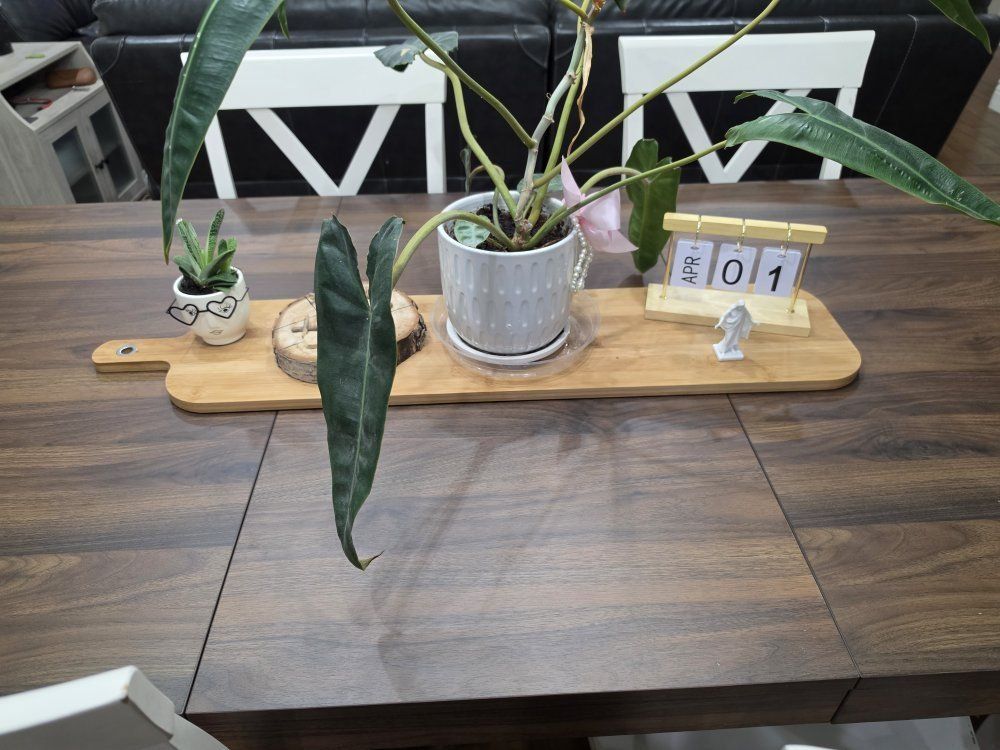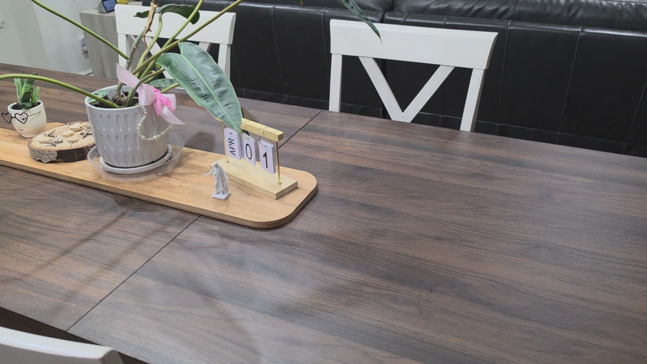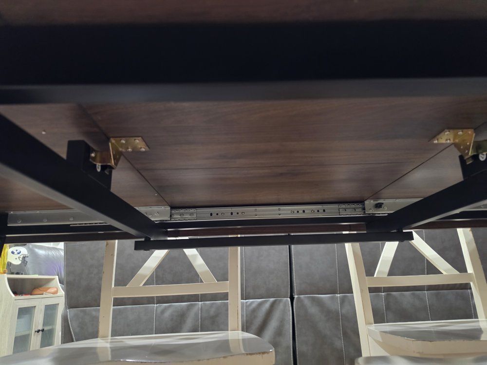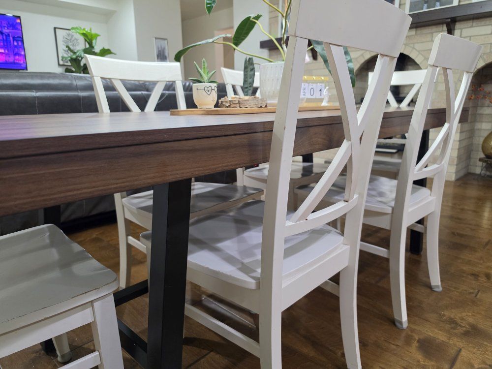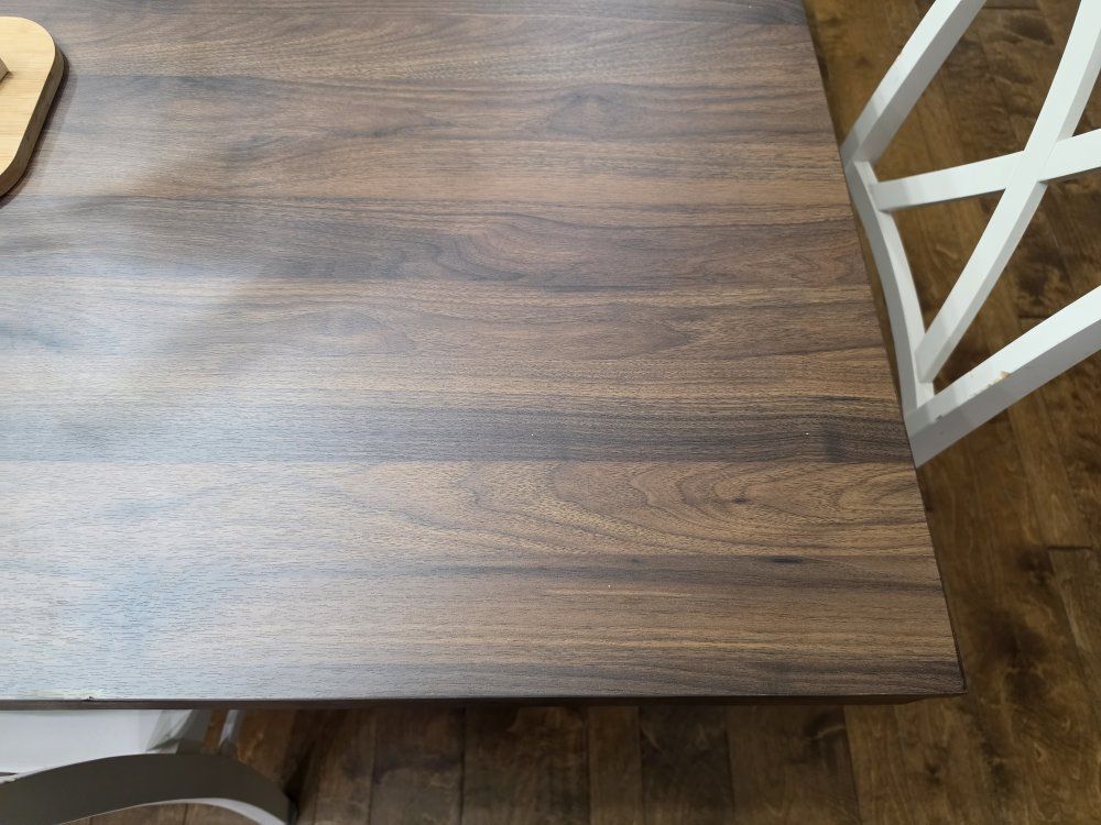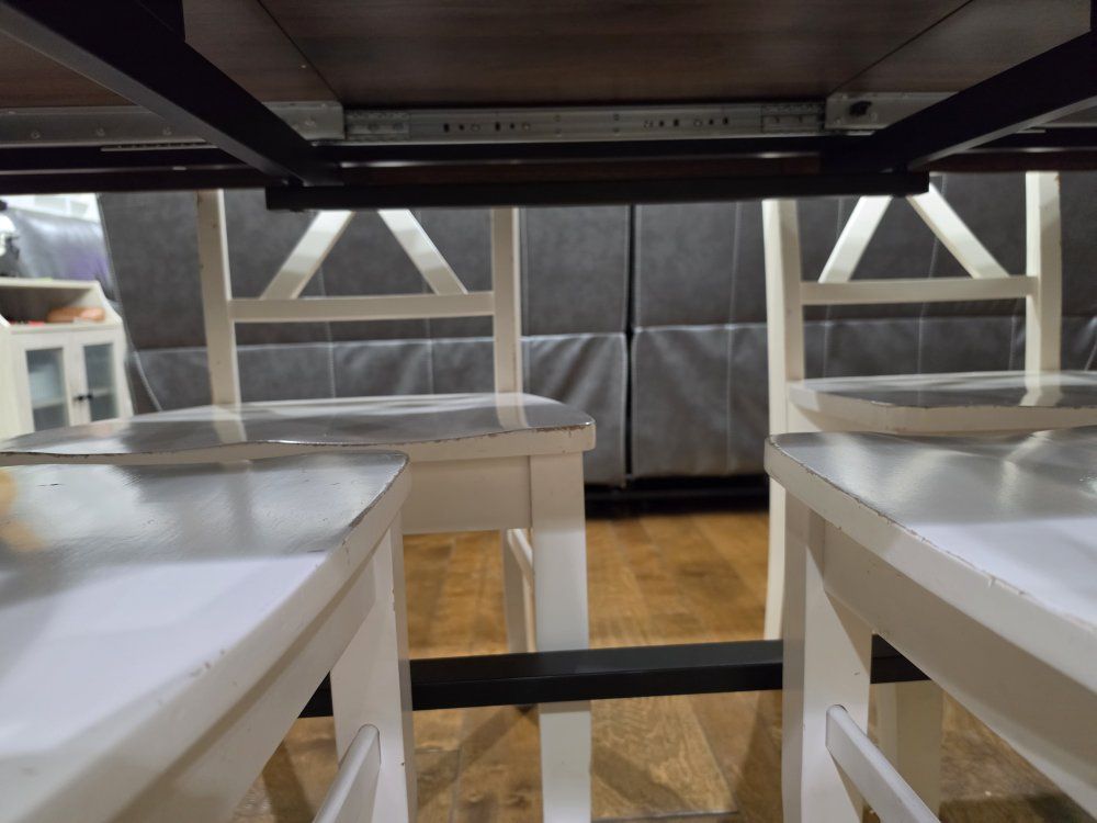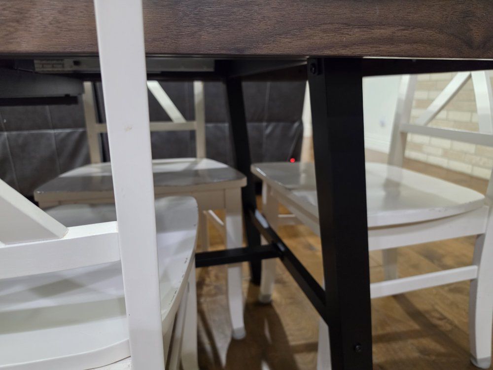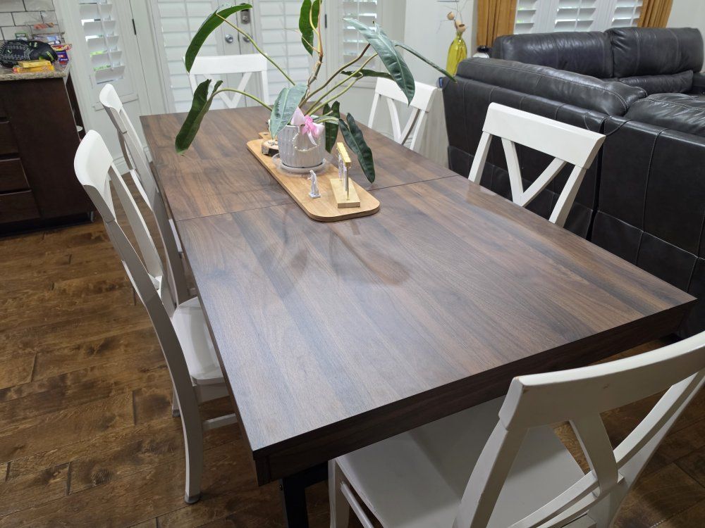 I'm an influencer and put this table together (took 2 days ) for a video shoot. it's brand new and ready for you to take home to put in your kitchen. it's a beautiful table! chairs not included. we have 6 with it, but I think it can fit 8 chairs. there's a hidden leaf that folds down into the table. the leaf is fully extended in the photos. it's very high quality. it's got a dark wood with black metal legs and frame for a little rustic charm.