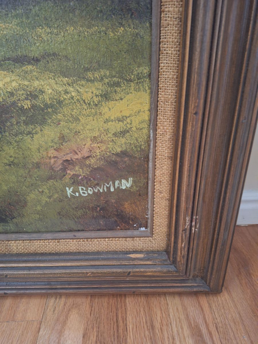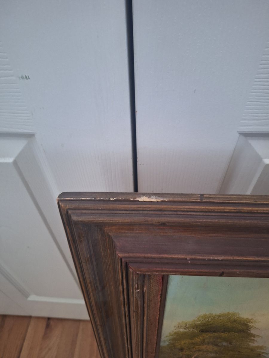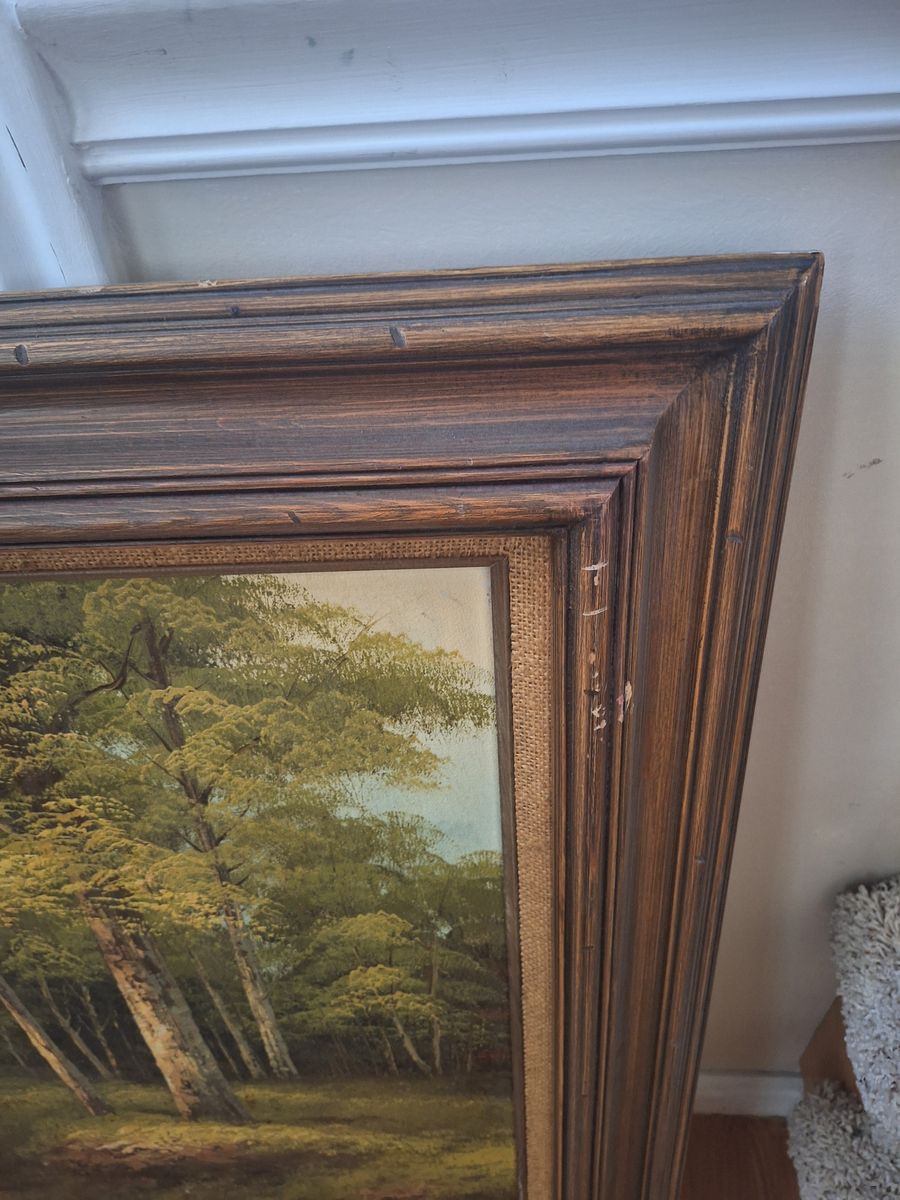 Vintage framed oil on canvas landscape painting featuring a forest waterfall scene. Frame needs work. 44" wide x 32.5" tall. Cash only.