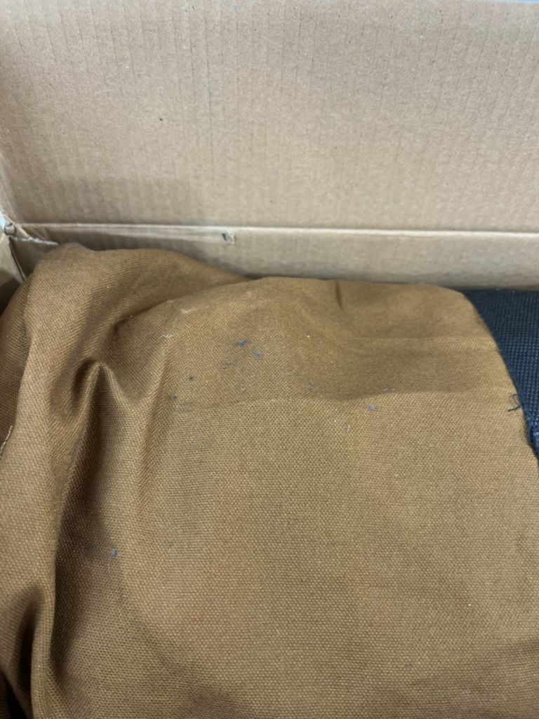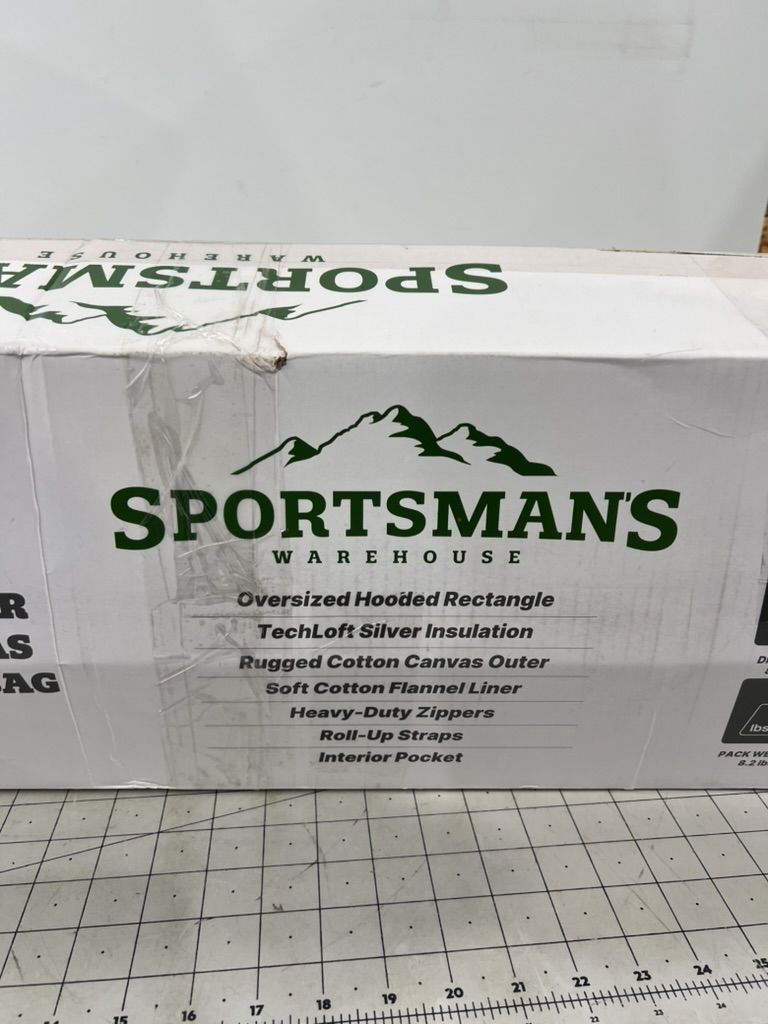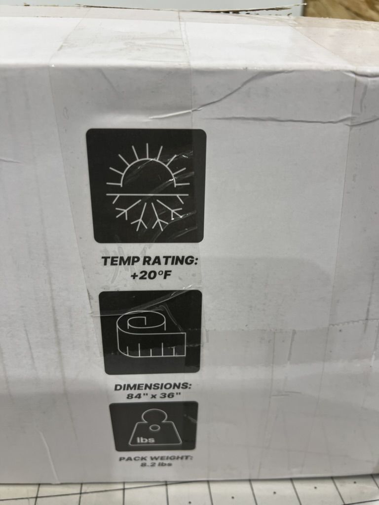 Box has minor wear and tear; sleeping bag in excellent condition. Dimensions: 84" x 36".