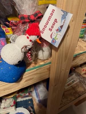 Ceramic snowman mugPaired with **soup mix (“Snowman Soup”)**Wrapped in cellophane pre-made holiday gift set