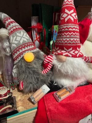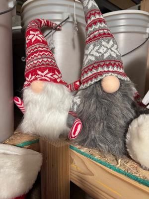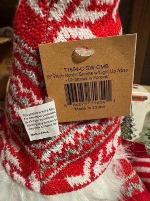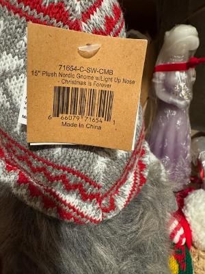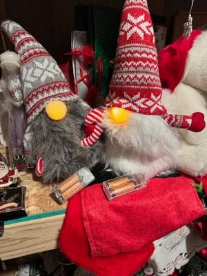 Pair of 15" plush Nordic gnomesTag reads: _“Christmas is Forever”_Feature: light-up nose (battery powered), noses glow; it takes batteries.