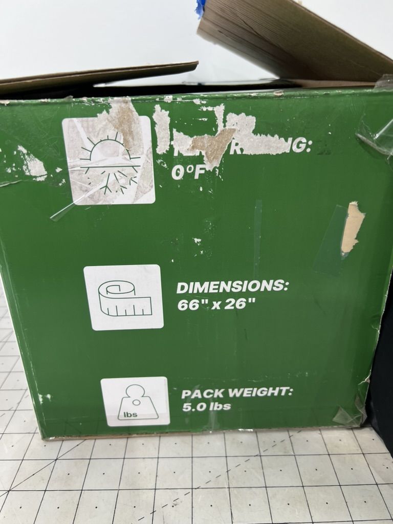 Box shows wear and tear, but contents appear intact. Measurements: 66" x 26".