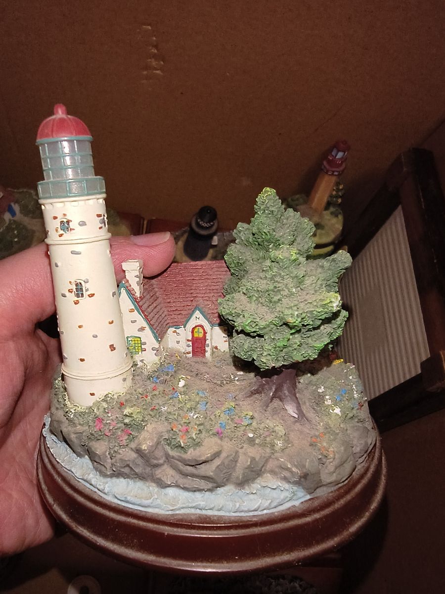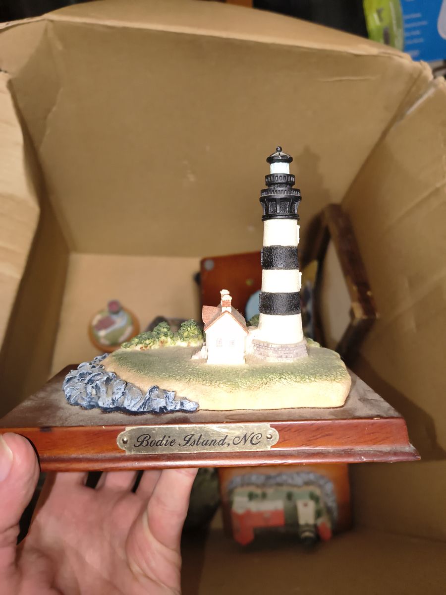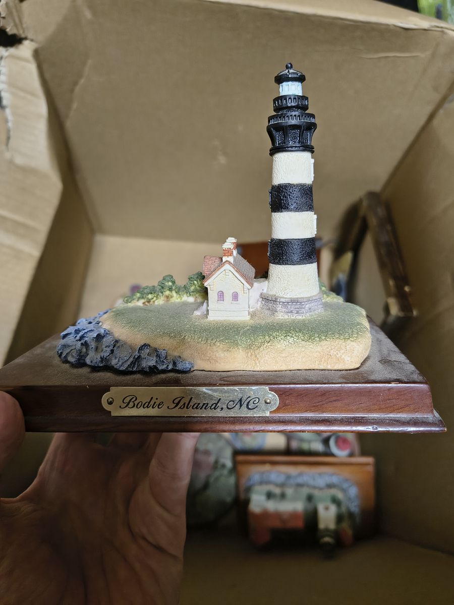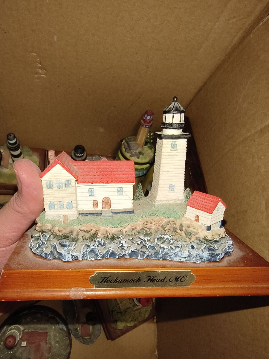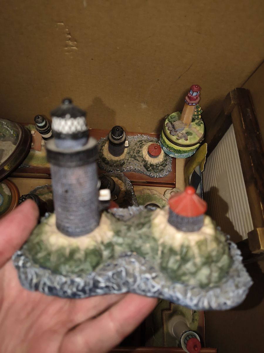 About 17 miniature lighthouses as well as a lighthouse wine cork a lighthouse hook and a lighthouse tile. Some of them appear to take a battery and light up. These have been in a storage for several years collecting dust so they are a bit Dusty most are in good shape though some have little nicks and scratches. I've seen a couple of them selling for 50 to $70 each online most are around 10 to $20 each online plus shipping take the whole box for 50 cash