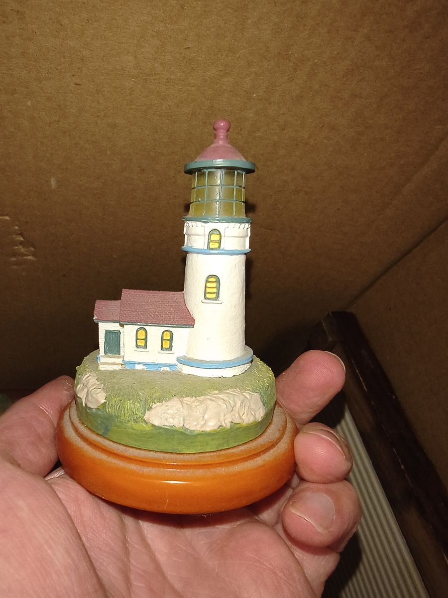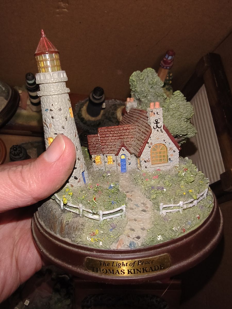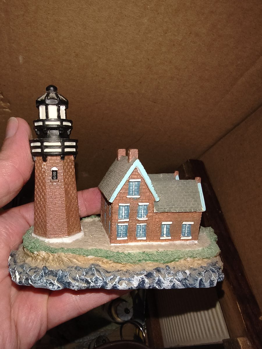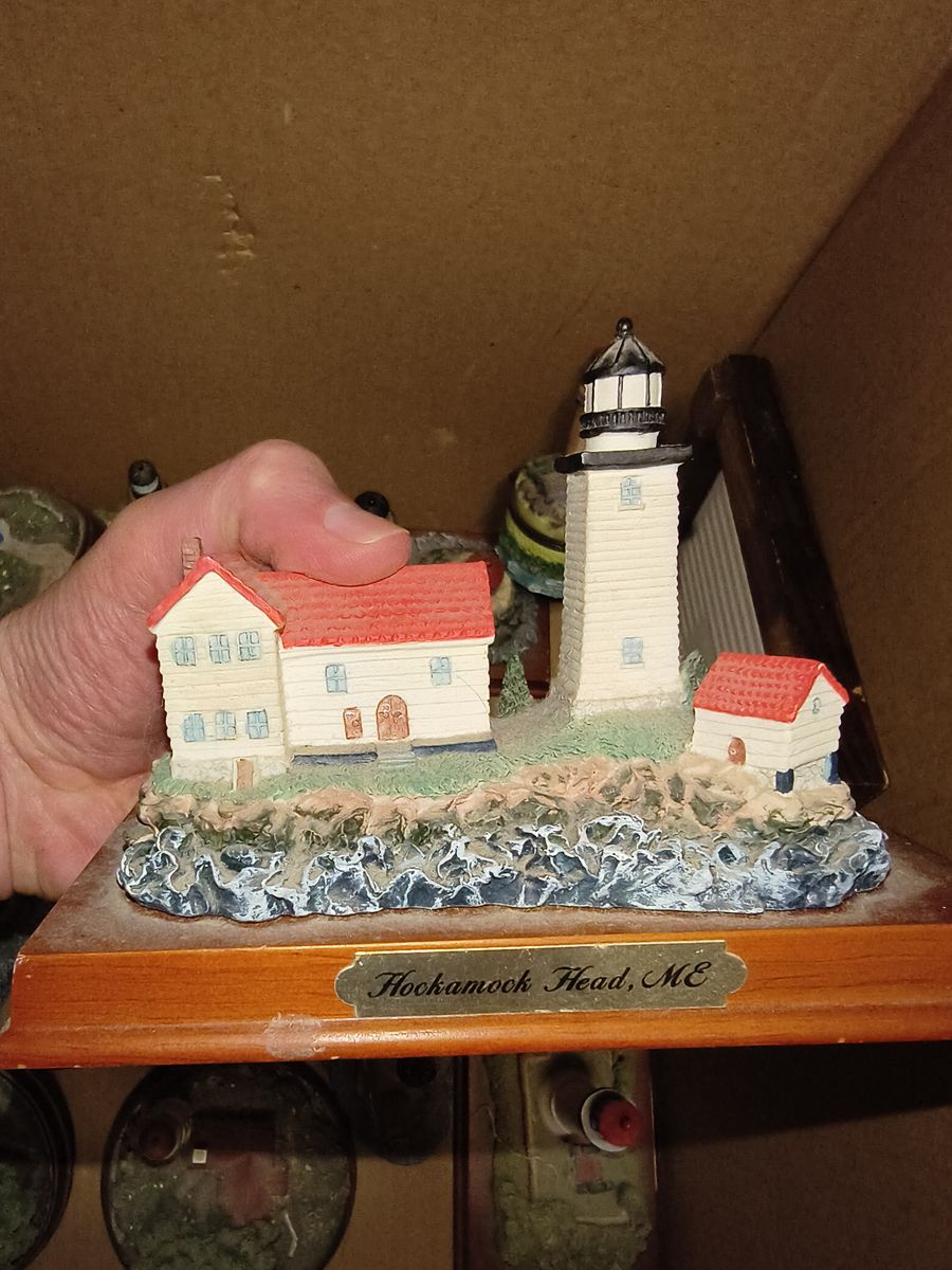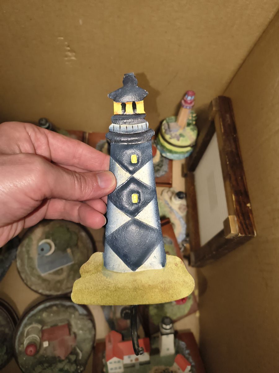 About 17 miniature lighthouses as well as a lighthouse wine cork a lighthouse hook and a lighthouse tile. Some of them appear to take a battery and light up. These have been in a storage for several years collecting dust so they are a bit Dusty most are in good shape though some have little nicks and scratches. I've seen a couple of them selling for 50 to $70 each online most are around 10 to $20 each online plus shipping take the whole box for 50 cash