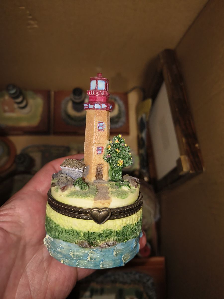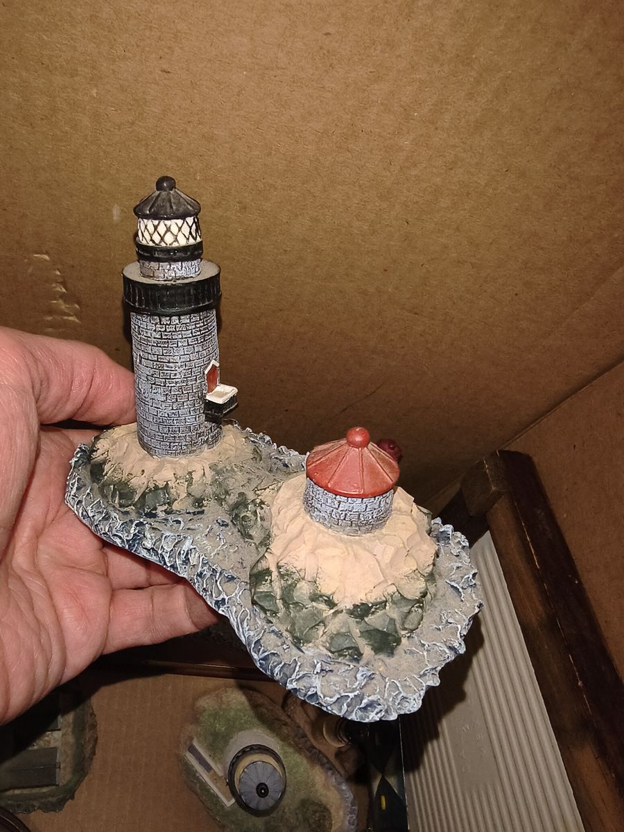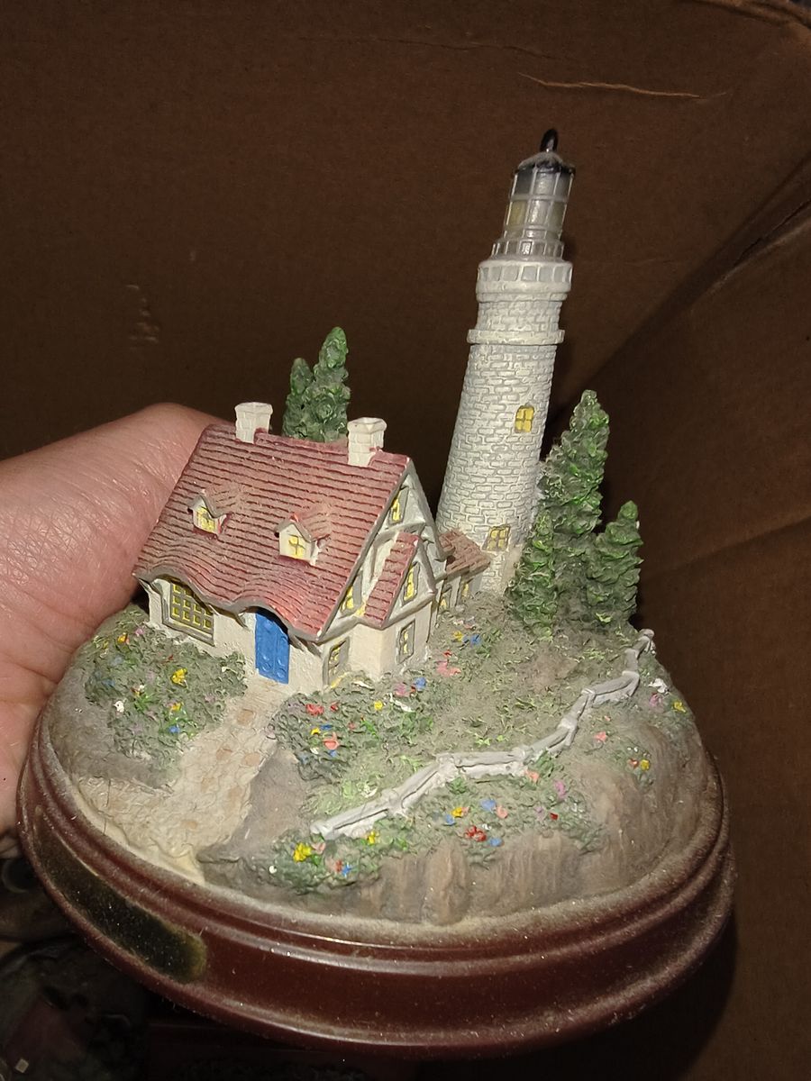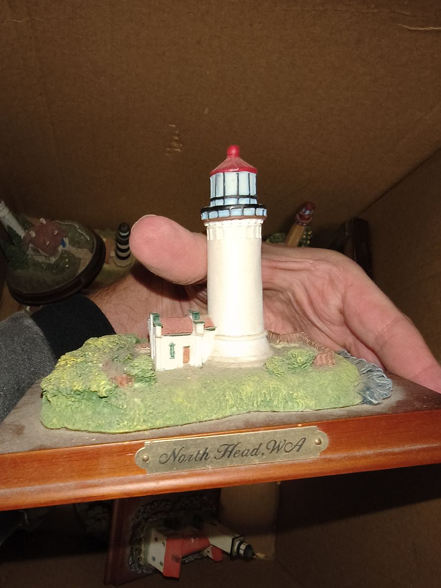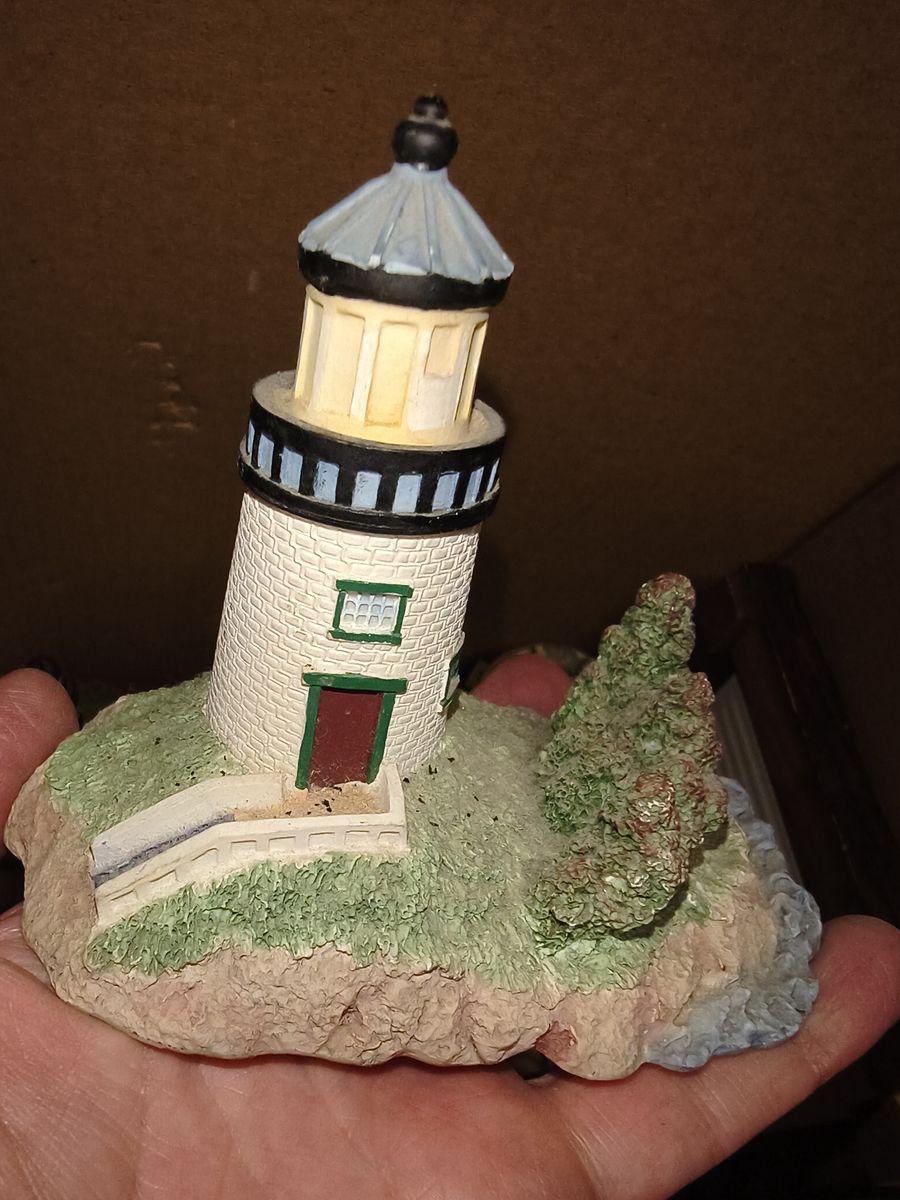 About 17 miniature lighthouses as well as a lighthouse wine cork a lighthouse hook and a lighthouse tile. Some of them appear to take a battery and light up. These have been in a storage for several years collecting dust so they are a bit Dusty most are in good shape though some have little nicks and scratches. I've seen a couple of them selling for 50 to $70 each online most are around 10 to $20 each online plus shipping take the whole box for 50 cash
