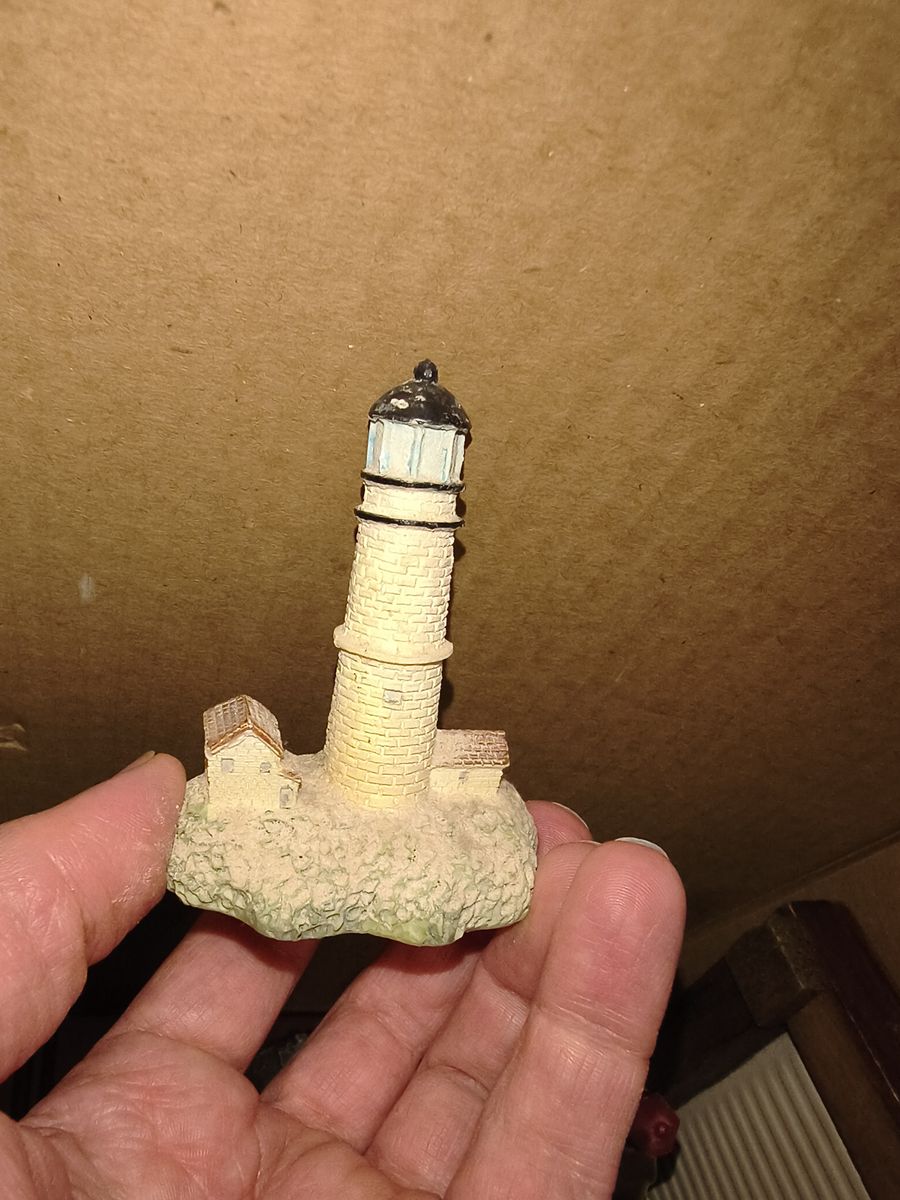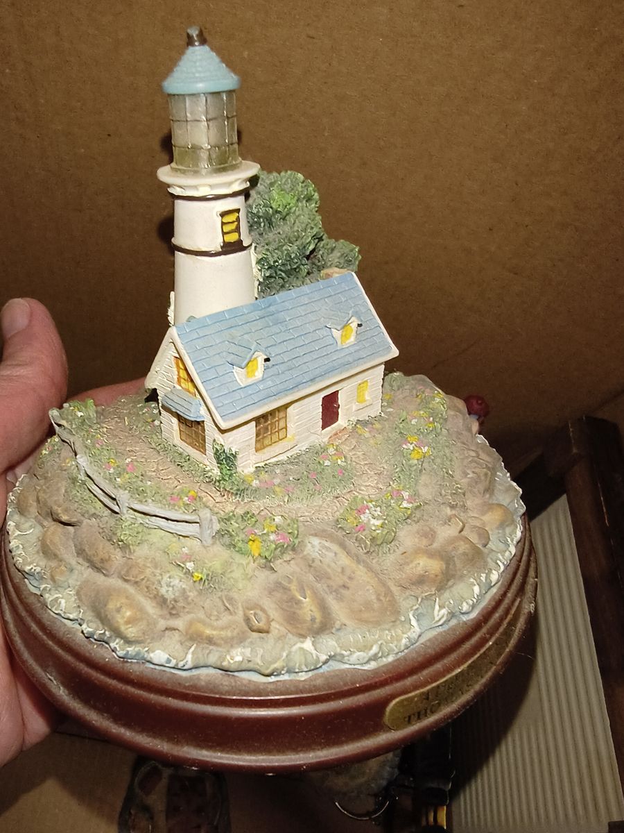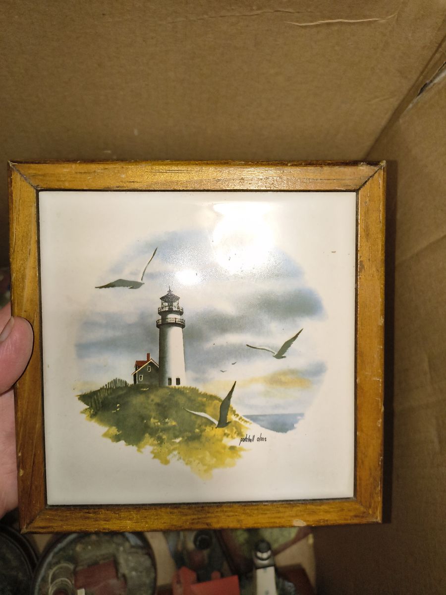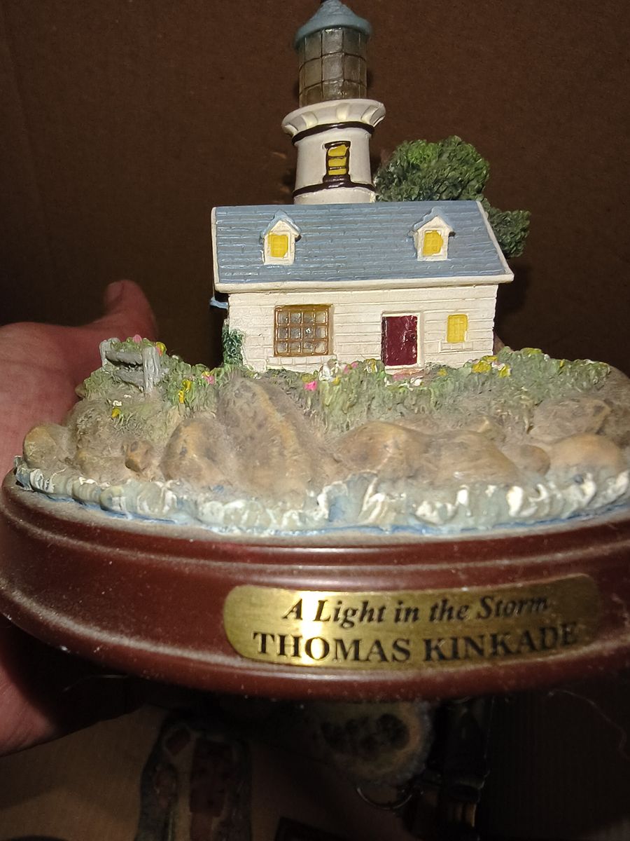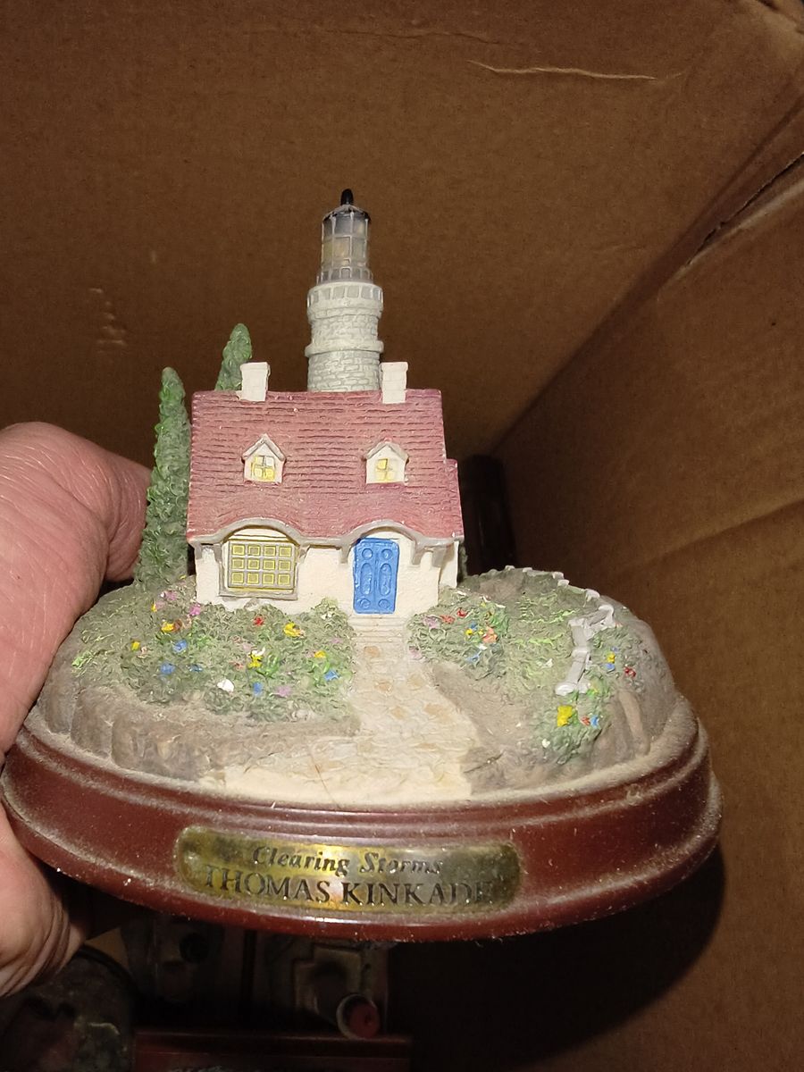 About 17 miniature lighthouses as well as a lighthouse wine cork a lighthouse hook and a lighthouse tile. Some of them appear to take a battery and light up. These have been in a storage for several years collecting dust so they are a bit Dusty most are in good shape though some have little nicks and scratches. I've seen a couple of them selling for 50 to $70 each online most are around 10 to $20 each online plus shipping take the whole box for 50 cash