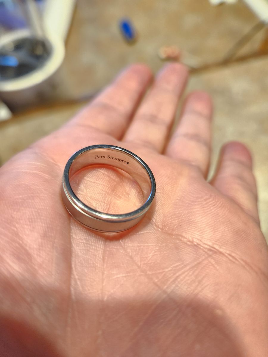 PayPalmen's wedding ring new never used. 14k white gold. inscribed inside is Por Siempre. According to Google, a jewler can remove this if you wish. Accepting paypal. Venmo I will send this free with USPS, insured, registered and requiring a signature upon delivery. Willing to look at serious offers.