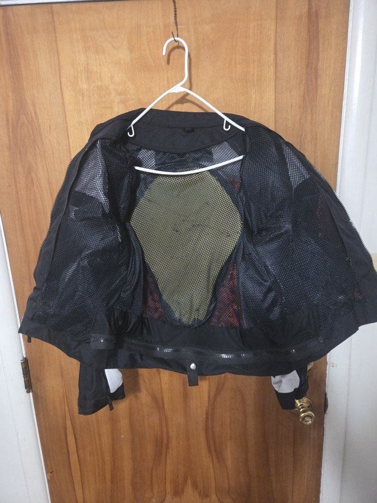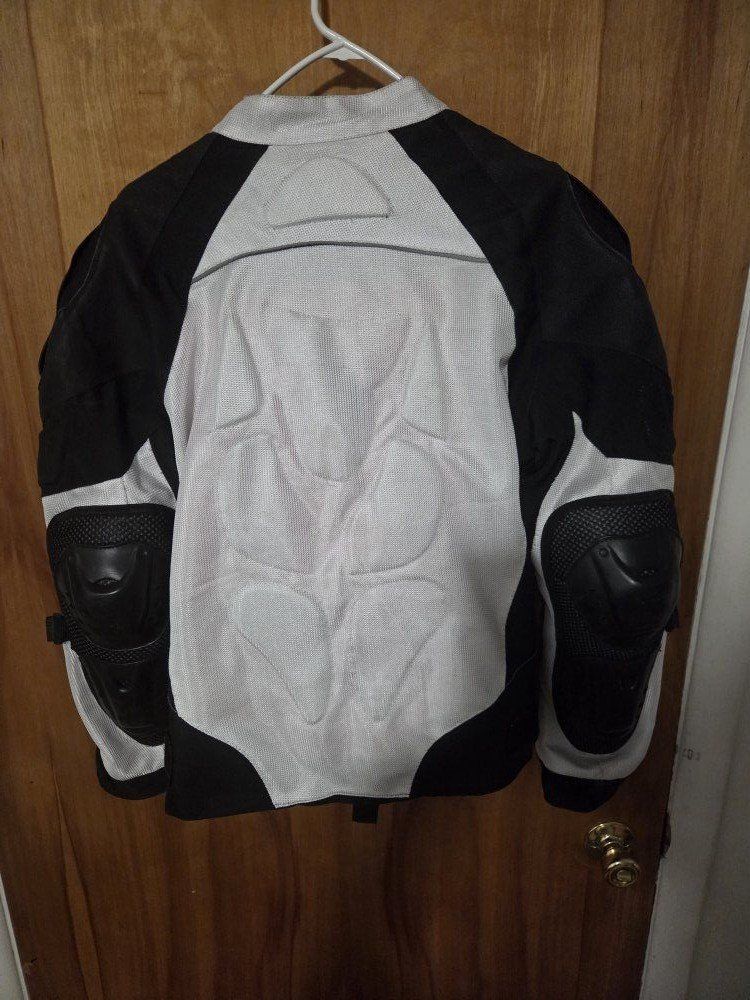 MD size riding jacket with armor. I can't see manufacturer or model. 1 of the arm tightening straps is frayed. See my other listings.