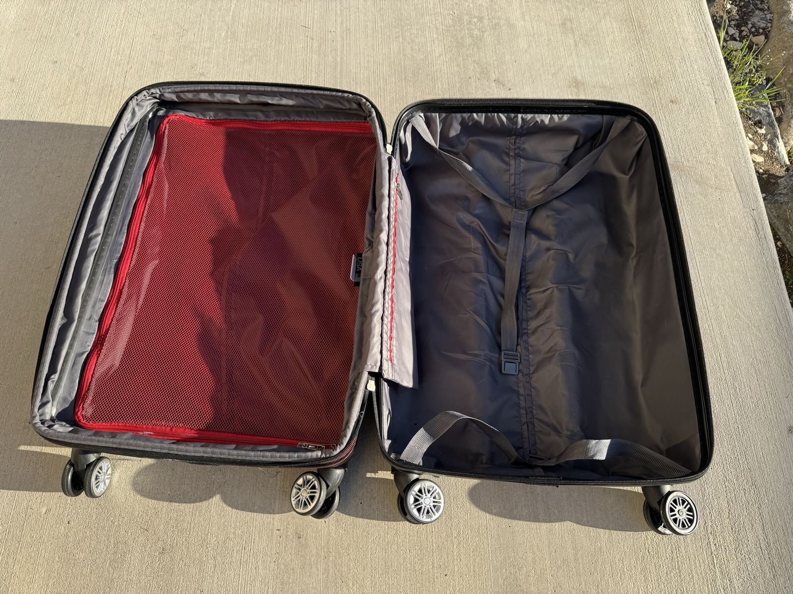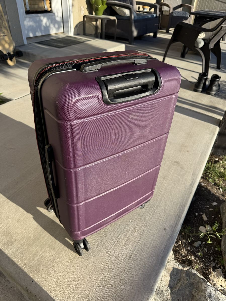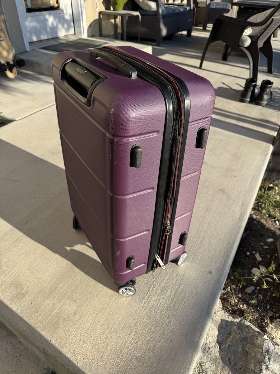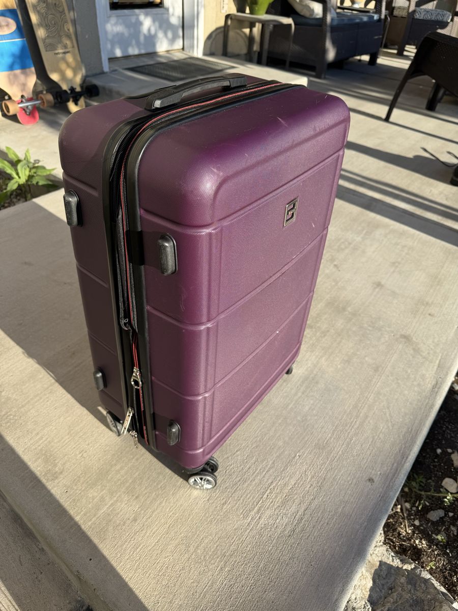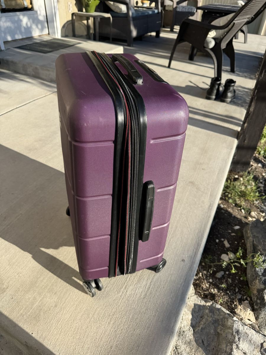 ZellePurple Solite suitcase for sale, measures approximately 26.5”x17”x10.5”. Has a compression zipper and rolls smoothly even when upright. There are scratches on the outside of the case as seen in pictures
